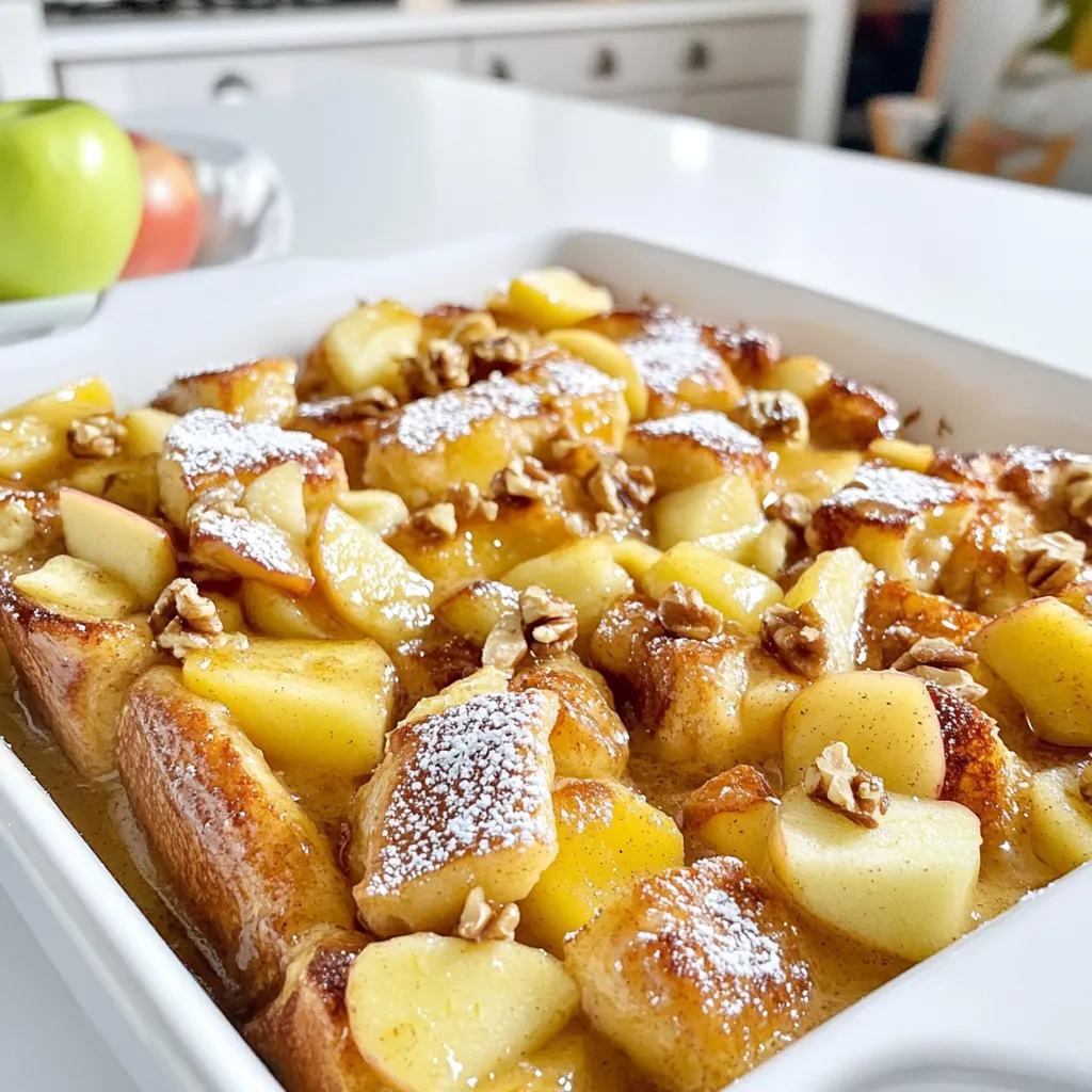 Applesauce keeps the casserole moist and adds natural sweetness. Maple syrup adds richness and a touch of caramel flavor. Fresh apples give a nice crunch. If you like, toss in walnuts for added texture. Lastly, powdered sugar and fresh apple slices make for a beautiful presentation. Enjoy the layers of flavor!
