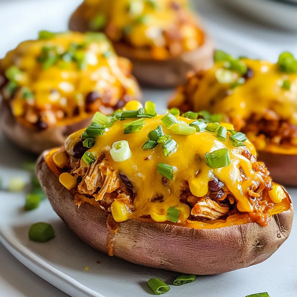 - 4 medium sweet potatoes - 2 cups shredded cooked chicken - 1/2 cup barbecue sauce - 1/2 cup corn - 1/2 cup black beans - 1/2 cup shredded cheddar cheese - 1/4 cup green onions - 1 tablespoon olive oil - Salt and pepper to taste - Sour cream - Diced avocado - Sliced jalapeños The main ingredients in BBQ chicken stuffed sweet potatoes create a rich and hearty meal. Sweet potatoes offer a sweet and creamy base. Shredded chicken adds protein and flavor. A good barbecue sauce gives a smoky touch, enhancing the dish. In addition, corn and black beans add texture and nutrients. Corn brings sweetness, while black beans add fiber. Shredded cheddar cheese melts beautifully on top, giving a savory finish. The green onions add a fresh crunch, balancing the flavors. You can customize your meal with optional toppings. Sour cream adds creaminess, while diced avocado brings richness. Sliced jalapeños give a spicy kick. Each topping allows you to adjust the dish to your taste. This recipe is simple, tasty, and packed with nutrition. The ingredients work together to create a filling meal that is sure to please. {{ingredient_image_2}} - Preheat the oven to 400°F (200°C). - Rinse the sweet potatoes under cold water. Scrub them to remove any dirt. Use a fork to poke several holes in each potato. This helps steam escape while they bake. - Place the sweet potatoes on a baking sheet lined with parchment paper. Bake for 45-60 minutes. They are ready when a fork pierces them easily. Once done, take them out and let them cool slightly before handling. - In a medium bowl, mix the shredded chicken, barbecue sauce, corn, black beans, and chopped green onions. Stir well until all the ingredients are coated in the sauce. This mixture adds flavor and nutrition to the dish. - When the sweet potatoes are cool, slice each one in half lengthwise. Use a spoon to scoop out some flesh, leaving about 1/4 inch for support. Fill each half with the BBQ chicken mixture. Press down slightly for a packed filling. - Sprinkle shredded cheddar cheese on top of each stuffed potato. Make sure to cover the filling evenly. Return them to the oven for 10-15 minutes. Bake until the cheese is melted and bubbly. This creates a tasty golden crust. How to know when sweet potatoes are done? Sweet potatoes are done when they feel soft. You can check by poking them with a fork. If it easily pierces through, they are ready. Keep an eye on them; they usually take 45-60 minutes. Best techniques for mixing filling: Mixing the filling is simple! Grab a bowl and add the chicken, barbecue sauce, corn, black beans, and green onions. Use a fork or spoon to blend everything well. Make sure each piece of chicken gets coated in sauce. This helps to keep the filling moist and tasty. Presentation tips for serving: To wow your guests, serve the stuffed sweet potatoes on a big platter. Drizzle some extra barbecue sauce on top for flair. You can also add small bowls with toppings like sour cream or avocado on the side. This lets everyone customize their meal. Suggested side dishes to complement the meal: Pair your stuffed sweet potatoes with a fresh salad or some grilled veggies. Corn on the cob works great too! You can also serve a light coleslaw for a crunchy texture. These sides balance the richness of the sweet potatoes. Ideas for additional seasonings: If you want to spice things up, add some cumin or chili powder to the filling. A pinch of garlic powder or onion powder can also enhance the flavor. Just a little goes a long way! Suggestions for changing up the barbecue sauce: Feel free to switch out the barbecue sauce! You can use a spicy version for heat or a honey barbecue for sweetness. Try a homemade sauce with mustard or vinegar for a unique taste. The options are endless, so get creative! Pro Tips Perfectly Cooked Sweet Potatoes: To ensure your sweet potatoes are evenly baked, choose potatoes that are similar in size and shape. This will help them cook uniformly and achieve the desired tenderness. Customize Your Filling: Feel free to add other ingredients to your BBQ chicken mixture. Chopped bell peppers, diced tomatoes, or even a dash of hot sauce can enhance the flavor profile and add more texture. Cheese Variations: Experiment with different types of cheese for unique flavors. Try pepper jack for a spicy kick or feta for a tangy contrast to the sweetness of the potatoes. Meal Prep Friendly: These stuffed sweet potatoes can be made in advance. Prepare the filling and bake the potatoes, then assemble and reheat when ready to serve for a quick and easy meal. {{image_4}} - Gluten-free modifications: Use gluten-free barbecue sauce. Always check labels to ensure no gluten is present. - Vegan alternative options: Swap chicken for shredded jackfruit or chickpeas. Use a vegan barbecue sauce and skip the cheese or use a plant-based alternative. - Spicy BBQ chicken stuffed sweet potatoes: Add diced jalapeños to the filling for heat. You can also use a spicy barbecue sauce for an extra kick. - Southwestern-style variations with different spices: Mix in cumin, paprika, or chili powder. This gives the dish a warm, smoky flavor that pairs well with sweet potatoes. - Alternative ingredients for BBQ sauce: If you want a different taste, try using teriyaki sauce or a homemade sauce with ketchup and vinegar. - Different types of cheese to use: Cheddar is great, but feel free to try Monterey Jack or pepper jack. These cheeses melt well and add unique flavors. To store your BBQ chicken stuffed sweet potatoes, first let them cool. Once they are at room temperature, place them in an airtight container. You can keep them in the fridge for up to three days. If you want to freeze them, wrap each stuffed sweet potato tightly in plastic wrap. Then, place them in a freezer-safe bag or container. This method helps to prevent freezer burn. Frozen stuffed sweet potatoes will stay good for about three months. When it's time to enjoy your leftovers, you can reheat them in two wa