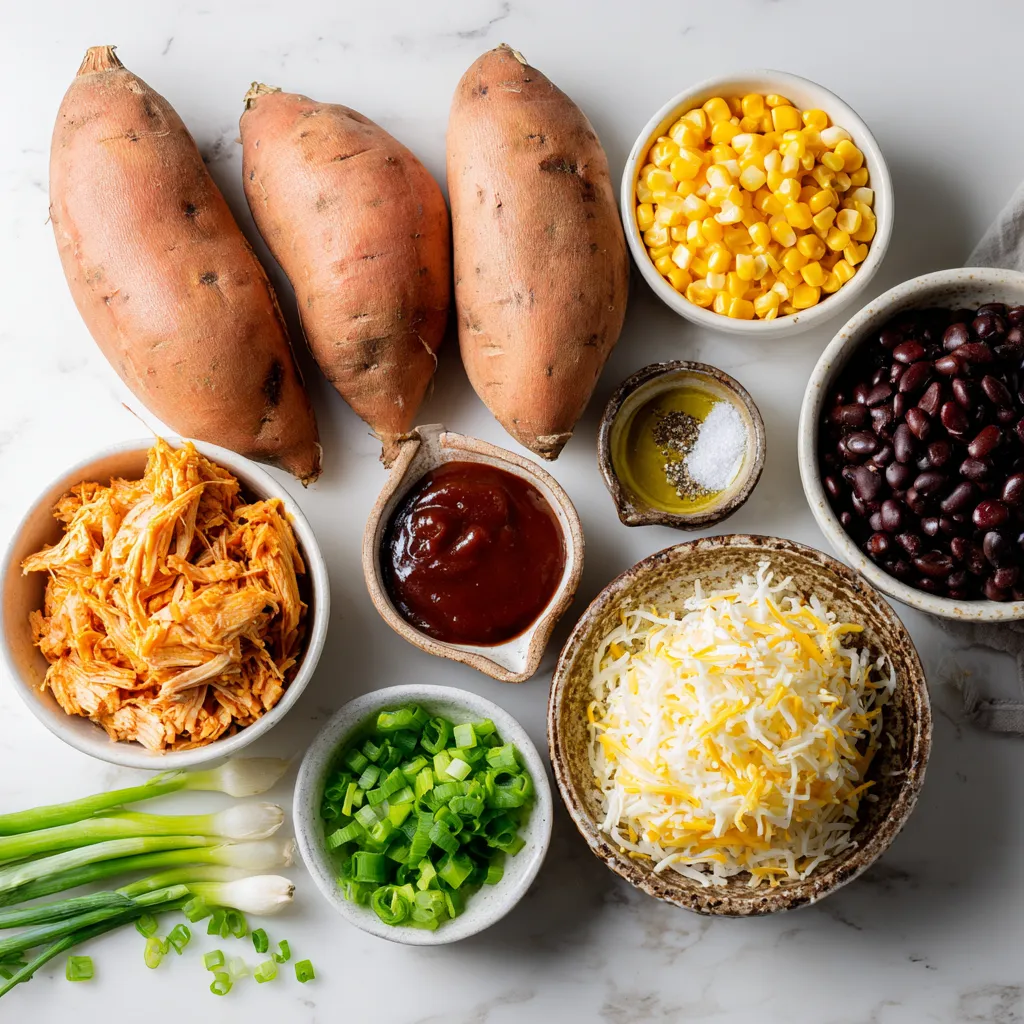 The main ingredients in BBQ chicken stuffed sweet potatoes create a rich and hearty meal. Sweet potatoes offer a sweet and creamy base. Shredded chicken adds protein and flavor. A good barbecue sauce gives a smoky touch, enhancing the dish.