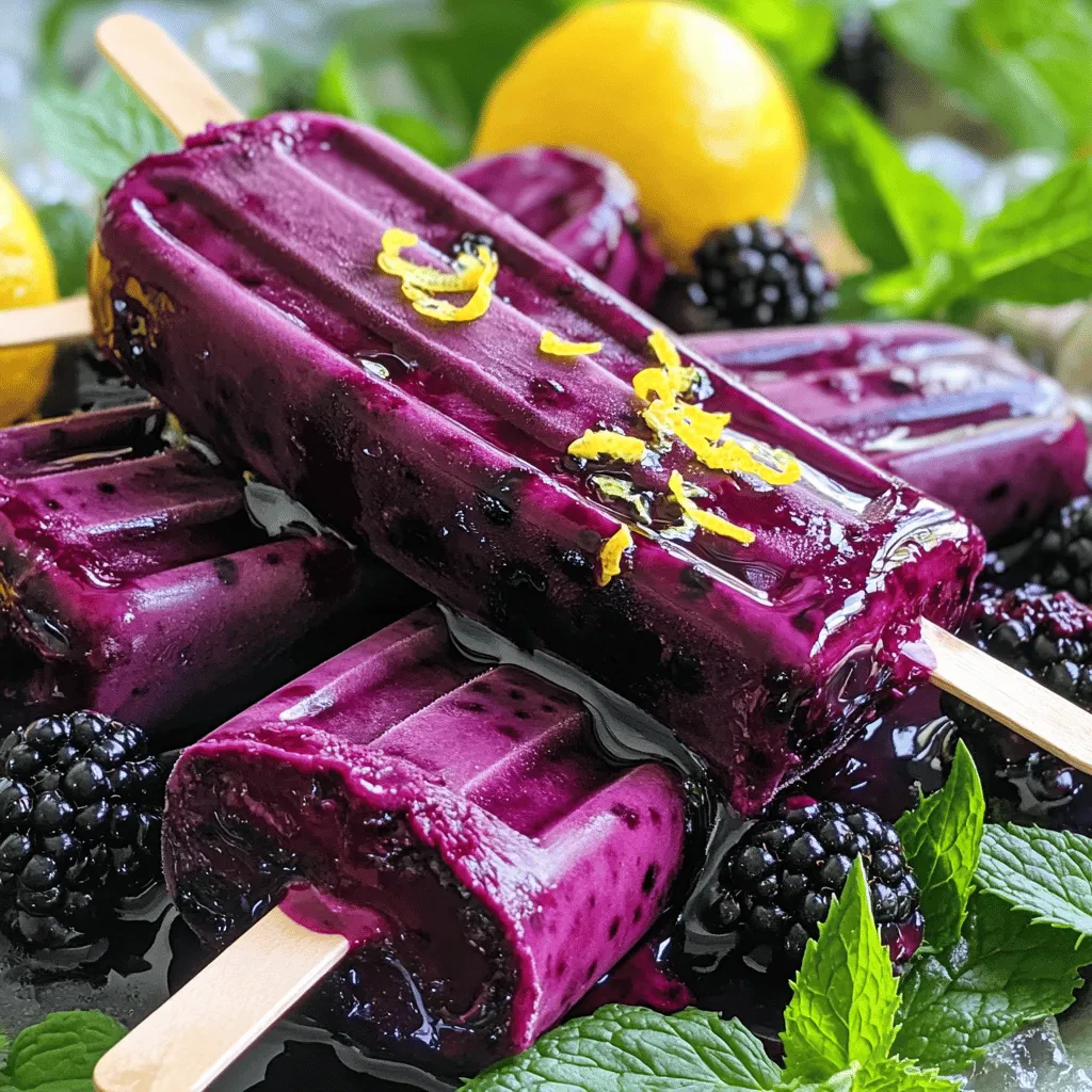 - 2 cups fresh blackberries - 1 cup freshly squeezed lemon juice (approximately 4-5 medium lemons) - 1/2 cup granulated sugar - 2 cups water, divided - Zest of 1 lemon - Fresh mint leaves for garnish (optional) I love the burst of flavor blackberries bring. They give a sweet and tart taste that pairs well with lemon. Fresh blackberries are key for the best flavor. You can also use frozen blackberries, but fresh ones taste better. Squeezing your lemons is important too. Use 4 to 5 medium lemons to make one cup of juice. The zest adds more lemon flavor. You need sugar to sweeten the mix. Adjust the amount to match your taste. Water helps to balance the flavors. You will divide it into two cups. One cup goes with the blackberries and the other with the lemonade. Optional mint leaves make a nice touch for garnish. This recipe is simple and fun to make. Enjoy creating this refreshing treat on a hot day! For the full recipe, check out the instructions provided earlier. First, grab a medium saucepan. Combine 2 cups of fresh blackberries with 1 cup of water. Heat this mixture on medium flame. Stir it occasionally. After about 5 to 7 minutes, the blackberries will soften. You will see the juices release, and the mix will get syrupy. Next, take a fine mesh sieve. Carefully pour your cooked blackberry mixture through it into a bowl. Use a spoon to press down on the solids. This step helps you extract as much juice as possible. Discard the solids left in the sieve. You should now have rich, flavorful blackberry juice. In the same saucepan, add the remaining ingredients. Combine 1 cup of water, 1 cup of freshly squeezed lemon juice, 1/2 cup of granulated sugar, and the zest of 1 lemon. Heat this mix on medium, stirring often. Keep stirring until the sugar fully dissolves. Once dissolved, remove it from heat and let it cool slightly. Once both the blackberry juice and lemonade have cooled to room temperature, combine them in a large pitcher. Stir the two mixtures well. Take a moment to taste it. If you want it sweeter, add more sugar until you get your perfect balance. Carefully pour the mixture into popsicle molds. Leave a small gap at the top of each mold. This space allows for expansion as they freeze. If your molds do not come with sticks, insert wooden popsicle sticks into the center of each one. After at least 6 hours, check if the popsicles are solid. To remove them, run warm water over the outside of the molds for a few seconds. This helps loosen them. Gently pull the popsicles out and serve them right away for the best taste. Enjoy this refreshing treat! To get the best texture in your blackberry lemonade popsicles, cooling the mixtures is key. After you cook the blackberries, let them cool to room temperature. This helps the flavors blend better and ensures a smooth popsicle. Next, adjust the sweetness to your taste. Start with half a cup of sugar, but feel free to add more if you like it sweeter. Tasting the mixture before freezing helps you find the perfect balance. Presentation matters, especially for a fun treat like popsicles. Garnish your popsicles with fresh mint leaves. This adds a pop of color and a hint of freshness. You can also drizzle some leftover blackberry syrup over the popsicles before serving. It adds extra flavor and looks beautiful on a platter. Using the right tools can make your popsicle-making easier. For molds, silicone popsicle molds work best. They help pop the treats out easily. You’ll also need a fine mesh sieve for straining the blackberry juice. A medium saucepan is essential for cooking the berries and making the lemonade. These tools will set you up for success in creating your delicious popsicles. For the full recipe, check out the detailed steps above. {{image_4}} You can make these blackberry lemonade popsicles even more fun by adding other fruits. Strawberries and raspberries mix well with blackberries. Their sweet and tart flavors blend nicely. You can mash them or slice them and add them to the mixture before freezing. Another tasty option is using different citrus juices. Try lime or orange juice for a fresh twist. Each fruit brings its unique taste, making your popsicles even more exciting. For those watching their sugar intake, there are easy swaps. You can use sugar substitutes like stevia or monk fruit. They add sweetness without the calories. If you want a different base, try coconut water instead of regular water. Coconut water adds a hint of tropical flavor. You can also use herbal teas, like chamomile or mint, for a refreshing twist. These options keep your popsicles delicious and a bit healthier. To add depth to your popsicles, consider flavor infusions. Fresh herbs like basil or rosemary can make the popsicles unique. Just add a few leaves to the mixture before blending. The herbs add a nice scent and flavor. Another option is mixing in flavored extracts. A drop of vanilla or almond extract can enhance the taste. Experiment with different combinations to find your favorite. Each infusion can turn a simple popsicle into a gourmet treat. For the full recipe, check out [Full Recipe]. To keep your popsicles fresh, freeze them for up to eight weeks. This time frame offers the best taste and texture. If you plan to keep them longer, wrap the molds in plastic wrap or foil. This helps prevent freezer burn. Freezer burn can ruin the flavor, making them taste bland. Cleaning popsicle molds is easy. Just wash them with warm, soapy water. Rinse well to remove all soap. To remove popsicles easily, let them sit at room temperature for a minute. You can also run warm water over the outside of the molds. This trick helps loosen the popsicles for a smooth release. To check if your popsicles are still good, look for ice crystals or a strange odor. These signs mean they may have gone bad. If they look or smell off, it's best to toss them. The recommended shelf life for these popsicles is about two months in the freezer. Enjoy them while they're fresh for the 