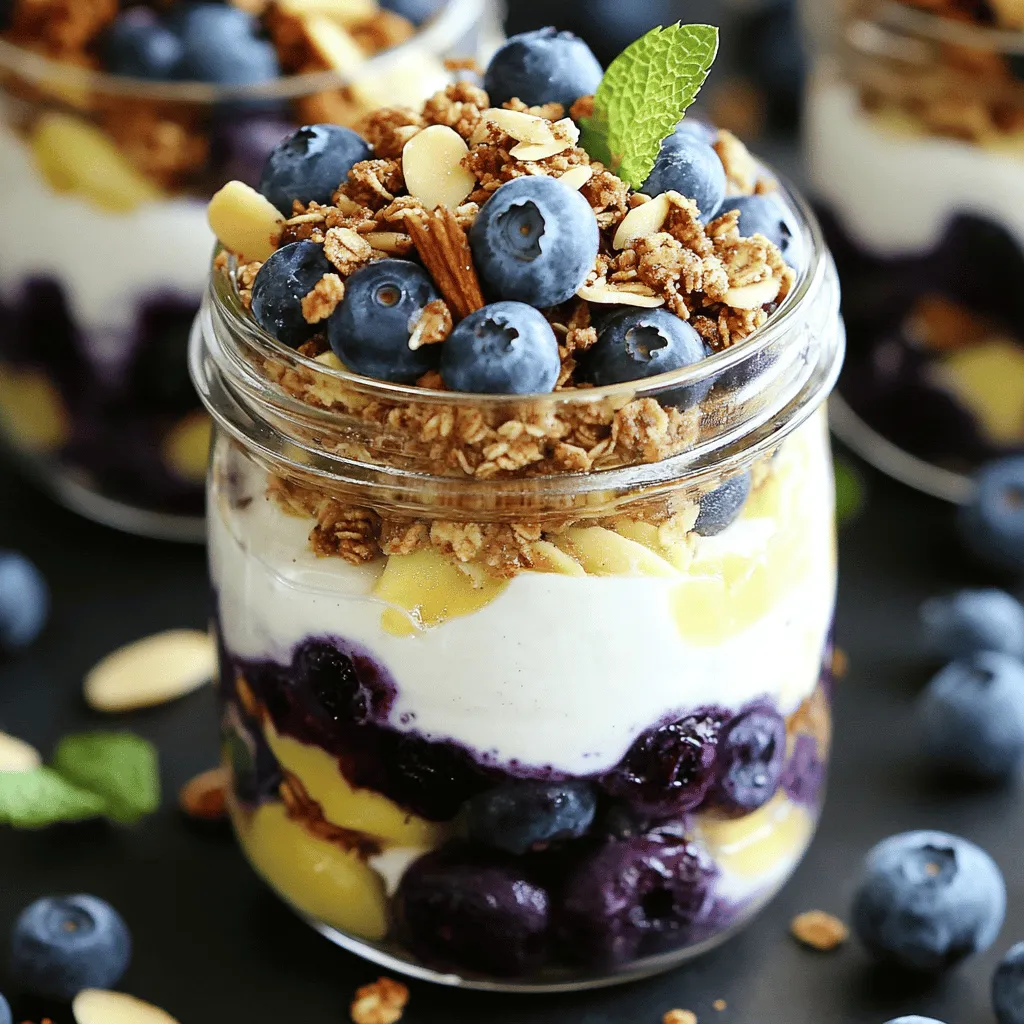 To make your parfaits pop, use clear glasses. This way, you can see the colorful layers. Chill the glasses beforehand for a fresh touch. Use bright blueberries and mint leaves to add color and flair. A sprinkle of granola on top creates a nice texture contrast. Remember, people eat with their eyes first!