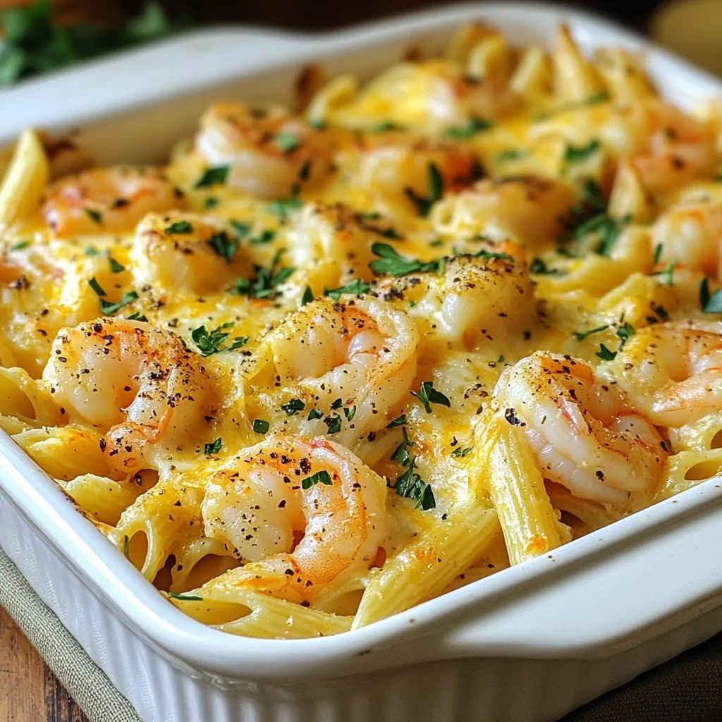 A flavorful and creamy pasta bake with shrimp and Cajun spices, topped with cheese.
