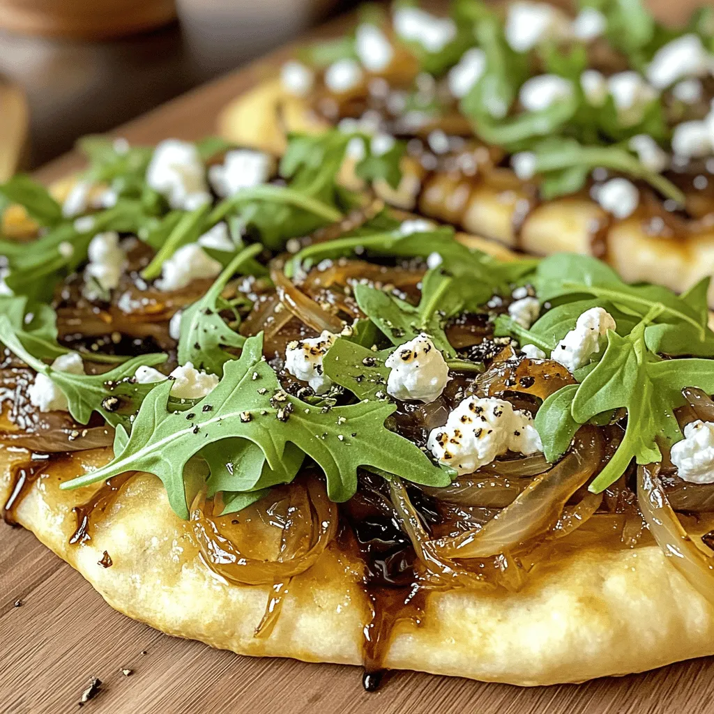 I choose either store-bought or homemade flatbread for this recipe. Homemade flatbread gives a personal touch, while store-bought saves time. Next, I use two large onions, sliced thin. The onions need to be sweet and soft after cooking. The olive oil helps to cook the onions evenly. I add sea salt and sugar to enhance their natural sweetness. Finally, I crumble the creamy goat cheese over the onions.