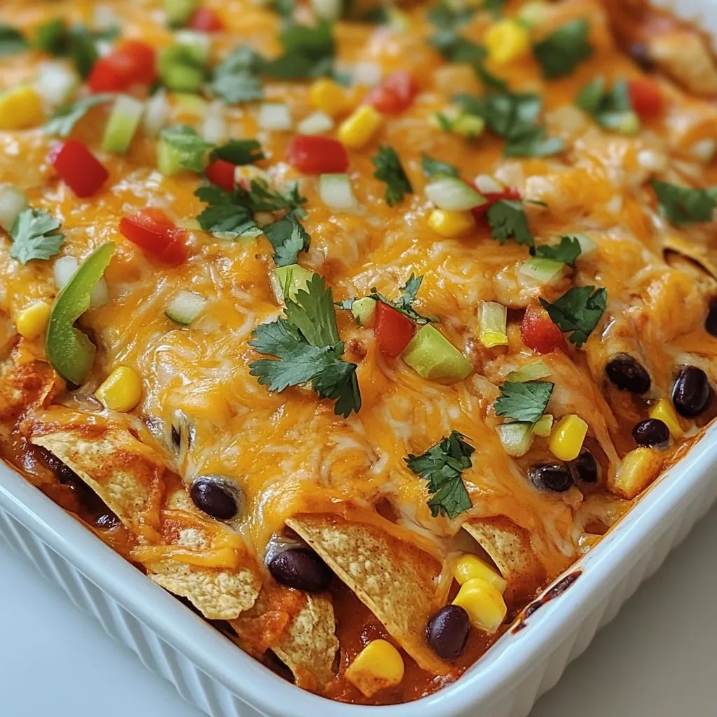 - 2 cups cooked shredded chicken (or 1 can black beans) - 2 cups enchilada sauce (store-bought or homemade) - 3 cups corn tortillas (cut into strips) - 2 cups shredded cheddar cheese These main ingredients form the heart of the casserole. The chicken or black beans give it protein and flavor. Enchilada sauce adds tang and spice. The corn tortillas act as layers, making it hearty. Cheese binds everything together, ensuring every bite is cheesy and delicious. - 1 cup diced bell peppers (mix of red and green) - 1 cup diced onion - Fresh cilantro (for garnish) Adding diced peppers and onions gives the casserole more texture. It also adds color and freshness. If you like, sprinkle fresh cilantro on top before serving. This adds a nice pop of flavor and makes the dish look beautiful. - 1 teaspoon ground cumin - 1 teaspoon chili powder - Salt and pepper to taste Seasoning is key to making the flavors shine. Ground cumin adds warmth and earthiness. Chili powder brings a little heat and depth. Don’t forget to add salt and pepper. They enhance all the other flavors in your casserole. {{ingredient_image_2}} - Preheat the oven to 350°F (175°C). - Spread a thin layer of enchilada sauce in your baking dish. This stops sticking. - In a big bowl, mix the shredded chicken or black beans with: - 1 can black beans, rinsed - 1 can sweet corn, drained - 1 cup diced bell peppers - 1 cup diced onion - 1 teaspoon ground cumin - 1 teaspoon chili powder - Salt and pepper to taste - Stir well until everything combines. - Start with a layer of tortilla strips on the sauce. - Add half of the filling mixture. - Pour one-third of the enchilada sauce on top. - Sprinkle one cup of shredded cheese over that layer. - Repeat these steps for the last layers. - Cover the dish with aluminum foil. - Bake for 25 minutes first. - Then, remove the foil and bake for another 10-15 minutes. - Look for bubbling cheese and a golden top. - Let it cool for 5 minutes before serving. - Garnish with fresh cilantro if you like. - Enjoy every cheesy and tasty bite! For a vegetarian or vegan option, I suggest substituting shredded chicken with black beans. Black beans add protein and flavor. You can also use lentils or chickpeas for more variety. If you want a dairy-free cheese alternative, look for brands that use nuts or soy. These options melt well and taste great. To ensure your layers stick together, let each layer cool slightly before adding the next. This helps everything bond. Use enough sauce to moisten the tortillas. If they are too dry, they will not stick. For perfect cheese melt, bake the casserole covered for the first 25 minutes. Then uncover it for the last 10 to 15 minutes. This way, the cheese bubbles and turns golden brown. For the best sides, I recommend a fresh salad or rice. A simple green salad with lime dressing pairs well. You can also serve it with guacamole or sour cream for added flavor. Enjoy your cheesy enchilada casserole warm for the best taste! Pro Tips Layering is Key: Ensure that you layer the ingredients evenly to maintain a good texture and flavor throughout the casserole. Customize Your Heat: Adjust the amount of chili powder to suit your spice preference; for a milder dish, reduce the quantity. Make Ahead: You can prepare this casserole a day in advance. Just cover it and refrigerate until you’re ready to bake. Cheese Substitutions: Feel free to mix different types of cheese, like Monterey Jack or Pepper Jack, for a unique flavor twist. {{image_4}} To spice things up, I love adding jalapeños or chipotle sauce. Just chop the jalapeños and mix them into your filling. If you prefer a smoky flavor, add chipotle sauce to the enchilada sauce. You can control the heat level by using fewer or more peppers. This adds a great kick! If you're looking for a healthier twist, use whole wheat tortillas instead of regular ones. They add fiber and nutrients. You can also swap in low-fat cheese options for a lighter dish. This way, you still enjoy all the cheesy goodness without the guilt. Don't be afraid to get creative with add-ins! You can mix in vegetables like zucchini, spinach, or mushrooms. They add great flavor and nutrition. For protein, try using turkey or tofu instead of chicken. These options make the casserole unique and cater to different tastes. To keep your Cheesy Enchilada Casserole fresh, let it cool first. Once cooled, cover it tightly with plastic wrap or aluminum foil. You can also place it in an airtight container. Store it in the fridge for up to three days. This way, the flavors stay rich and tasty. You can reheat leftovers in two ways: the microwave or the oven. - Microwave: Place a portion on a microwave-safe plate. Heat for 1-2 minutes, checking every 30 seconds. - Oven: Preheat the oven to 350°F (175°C). Place the casserole in a baking dish and cover it with foil. Heat for about 15-20 minutes until warm. This keeps the cheese melty and delicious. If you want to freeze the casserole, make sure it’s completely cooled. Cut it into portions for easier thawing. Wrap each portion tightly in plastic wrap, then in foil. Store it in the freezer for up to three months. When you’re ready to eat, thaw it in the fridge overnight. Reheat it in the oven or microwave. Enjoy those cheesy layers, even weeks later! You can easily make this dish vegetarian. Instead of using shredded chicken, use black beans. This swaps in protein and keeps the dish hearty. You can also add more veggies, like zucchini or spinach, for extra flavor and nutrients. This keeps the casserole tasty and satisfying. Yes, you can prep this casserole ahead of time. Assemble it and cover it tightly. Store it in the fridge for up to a day. When you’re ready to bake, let it sit at room temp for about 30 minutes. This helps it cook evenly. You can also freeze it for a later date. Just remember to thaw it in the fridge overnight before baking. This dish pairs well with a variety of sides. Consider a fresh garden salad with a light 