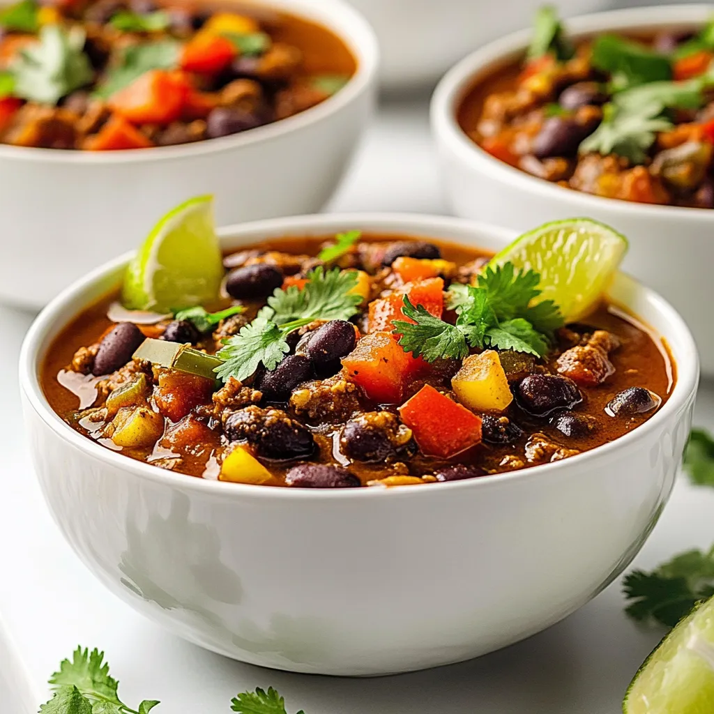 These ingredients create a rich and flavorful chili. The black beans add protein, while the chipotle gives it a nice kick. Remember to have fresh cilantro and lime wedges ready for serving. They will brighten up the dish and make it even tastier!