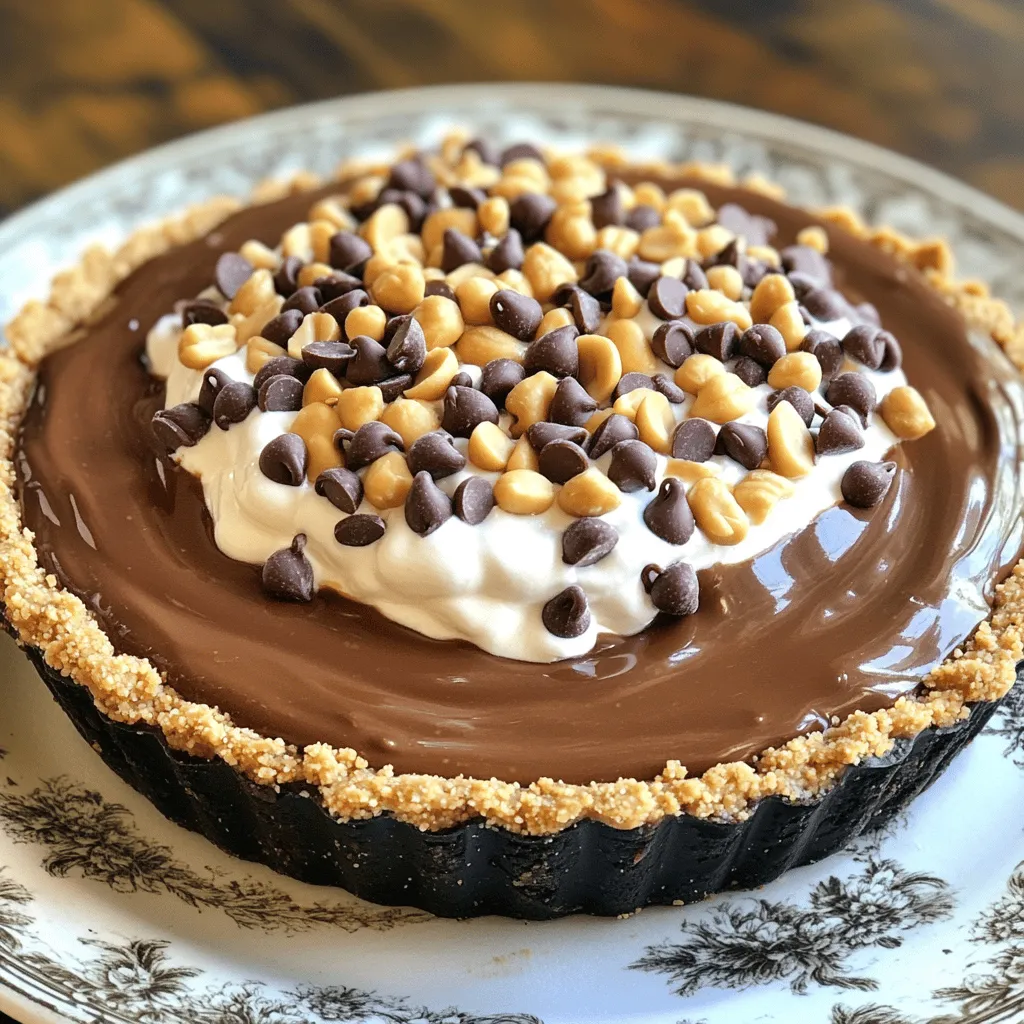 - 1 ½ cups chocolate graham cracker crumbs - ½ cup unsalted butter, melted - 1 cup creamy peanut butter - 1 cup powdered sugar - 8 oz cream cheese, softened to room temperature - 1 ½ cups whipped cream (or whipped topping) - ½ cup chocolate chips (for garnish) - Chopped peanuts (for garnish) Serving size for this pie is about 8-10 slices. If you need more or less, just adjust the ingredients. For example, double everything for a bigger pie. For the crust, you can swap chocolate graham crackers with regular graham crackers. This will change the flavor a bit but will still taste great. If you want a nut-free option, use crushed cookies instead. If you cannot find creamy peanut butter, try crunchy peanut butter. It adds a fun texture. You can also use almond or cashew butter for a different taste. If you need a dairy-free option, use a non-dairy cream cheese and whipped topping. Just check the labels to ensure they fit your needs. These simple swaps can help you make the pie your own while keeping it delicious! To make the chocolate graham cracker crust, start by mixing the crumbs and melted butter. In a medium bowl, combine 1 ½ cups of chocolate graham cracker crumbs with ½ cup of melted unsalted butter. Stir until it looks like wet sand. This step is key for a great crust. Next, press the mixture into a 9-inch pie dish. Make sure to cover the bottom and up the sides evenly. Use the back of a measuring cup to help you press it down flat. This helps the crust hold together. Chill the crust in the fridge for about 10 minutes. This will firm it up nicely. For the filling, mix 1 cup of creamy peanut butter with 8 oz of softened cream cheese. Use an electric mixer to beat them until smooth. This will create a creamy base for your pie. Next, sift in 1 cup of powdered sugar while mixing. This adds sweetness and makes the filling rich. After that, gently fold in 1 ½ cups of whipped cream. This gives the filling a light, airy texture. Be careful not to deflate the whipped cream; it should stay fluffy. Now it’s time to pour the filling into the chilled crust. Spread it evenly using a spatula. Make sure the top is smooth and nice. This step is important for a beautiful pie. After assembling, return the pie to the fridge. Chill it for at least 2 hours. This helps the filling set properly. When it is firm, your pie will be ready to slice and enjoy! - Overmixing the filling: When you mix the peanut butter and cream cheese, stop when it's smooth. Overmixing can make it too dense. - Not chilling the pie long enough: Be patient! Let the pie chill for at least two hours. This helps the filling set properly. - Tips for making the filling fluffier: Fold the whipped cream gently into the peanut butter mixture. This keeps the filling light and airy. - Serving suggestions for paired toppings: Try adding a drizzle of melted chocolate or a dollop of whipped cream on top. Chopped peanuts also add a nice crunch. - Creative ways to garnish the pie: Sprinkle chocolate chips and chopped peanuts on top. You can also add fresh berries for color. - Plate arrangements for stunning visuals: Serve slices on colorful dessert plates. Drizzle chocolate sauce around the plate for an extra touch. {{image_4}} You can create fun twists on this pie. Try different types of chocolate, like dark or white chocolate. Each type adds a new flavor. You can also substitute peanut butter with almond or cashew butter. This gives the pie a nice nutty taste. Explore these options to find your favorite! Want a vegan pie? Use plant-based cream cheese and whipped topping. Make sure your crust is vegan too. You can use coconut oil instead of butter. For a gluten-free version, swap chocolate graham crackers with gluten-free crumbs. These changes keep the pie tasty and friendly for various diets. Mini no-bake pies are easy to make! Use muffin tins or small jars. This way, each person gets their own pie. You can also turn the pie into parfaits. Layer the filling and crust in glasses for a fun presentation. This makes a great treat for parties or gatherings! To keep your Chocolate Peanut Butter No-Bake Pie fresh, store it in the fridge. Cover it tightly with plastic wrap or foil. This prevents it from absorbing other smells and flavors. If you want to save it longer, you can freeze it. Cut the pie into slices, wrap each piece in plastic, then place them in a freezer-safe bag. This method keeps the pie tasty for later enjoyment. In the fridge, this pie lasts about 4 to 5 days. Always check for signs of spoilage. If the pie looks dry or has an off smell, it’s best to toss it. Mold is another clear sign that the pie is no longer good. When you see these signs, do not eat it. When you’re ready to enjoy your stored pie, thaw it in the fridge overnight. This keeps the texture nice. If you’ve frozen slices, let them sit at room temperature for about 15 minutes before eating. To refresh the pie, add a dollop of whipped cream on top. This makes it look fresh and tasty! The pie needs to chill for at least 2 hours. This allows the filling to firm up nicely. I recommend checking it after this time. If it feels soft, give it more time. Yes, you can use crunchy peanut butter. This will add a nice texture to the pie. It gives little bites of peanut that add fun. The flavor remains rich and nutty, which I love. Cream cheese is important for a creamy texture. However, you can swap it with Greek yogurt or silken tofu. These options will change the taste slightly. They can still keep the pie smooth and delicious. You can definitely add more chocolate! Try adding chocolate syrup or more chocolate chips. Just be careful not to add too much. This can make the pie too heavy and change the texture. This blog post covered everything you need for a delicious no-bake peanut butter pie. We discussed the key ingredients, proper measurements, and tasty variations. I shared step-by-step instructions to guide you through the process and offered tips to avoid common mist