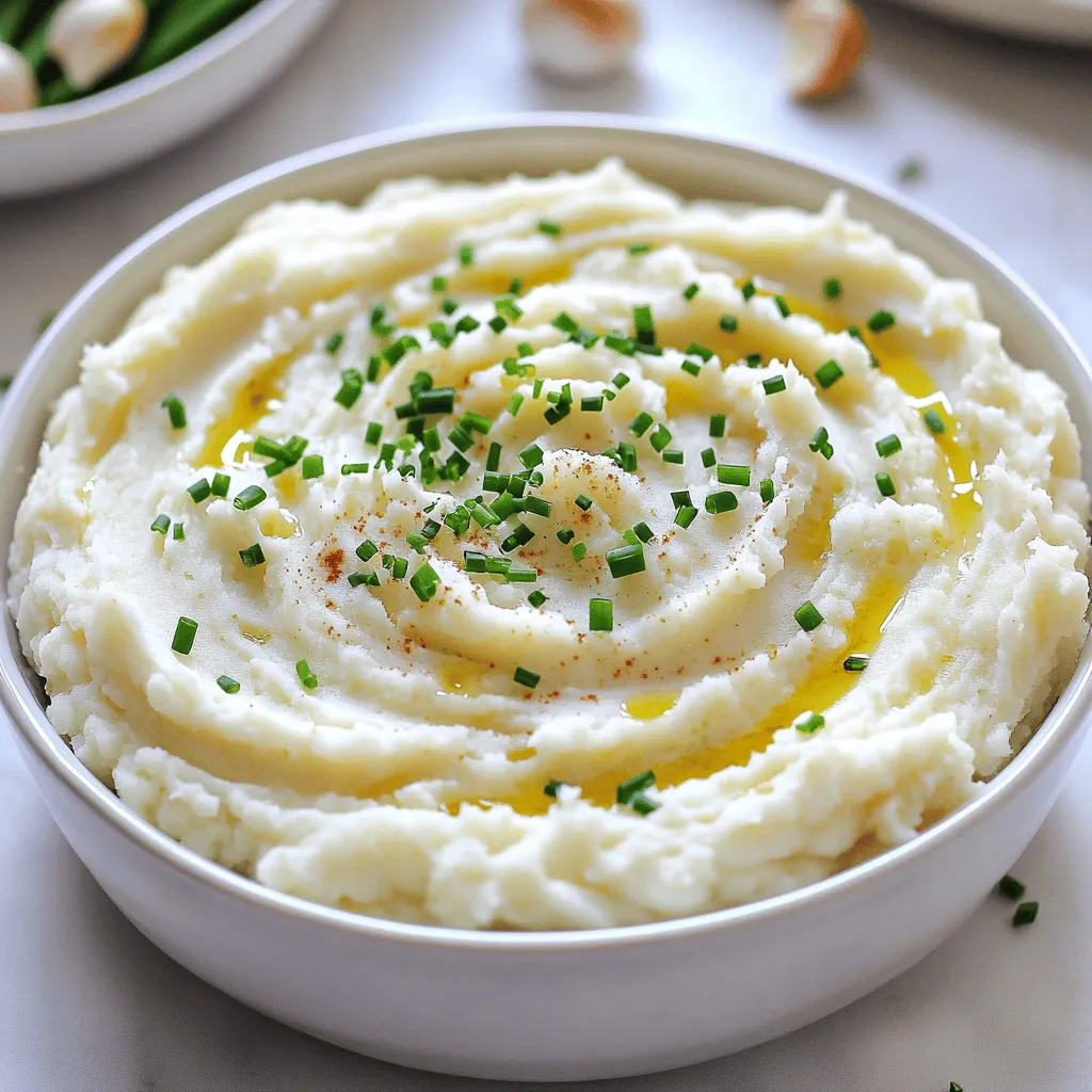![To make creamy garlic mashed cauliflower, you will need: - 1 large head of cauliflower, cut into small florets - 4 cloves garlic, finely minced - ½ cup cream cheese (or your preferred dairy-free alternative) - ¼ cup unsalted butter (or plant-based butter for a vegan option) - ½ cup shredded Parmesan cheese (optional, or substitute with vegan cheese) - ½ teaspoon salt - ¼ teaspoon freshly ground black pepper - ¼ teaspoon smoked paprika for added depth of flavor - Fresh chives or parsley for an aromatic garnish Feel free to get creative with your ingredients. You can add: - Extra garlic for a stronger flavor - Other cheeses like feta or goat cheese for a unique twist - Fresh herbs such as rosemary or thyme for added aroma - Nutritional yeast for a cheesy flavor without dairy - Cauliflower florets can be replaced with other veggies like broccoli Creamy garlic mashed cauliflower is not just tasty; it also has some great nutrition. Here’s a quick breakdown per serving: - Calories: Approximately 180 - Protein: 4g - Fat: 15g - Carbohydrates: 8g - Fiber: 3g This dish is lower in carbs than traditional mashed potatoes, making it a smart choice for many diets. Plus, it’s packed with vitamins and minerals from the cauliflower. For the full recipe, check out [Full Recipe]. First, gather your ingredients. You will need 1 large head of cauliflower, 4 cloves of garlic, ½ cup cream cheese, ¼ cup unsalted butter, ½ cup Parmesan cheese (if desired), salt, black pepper, and smoked paprika. Next, fill a large pot with water. Add a generous amount of salt to the water. Bring it to a rolling boil. Carefully add the cauliflower florets. Cook them for about 10 to 12 minutes. You want them to be fork-tender. Once the cauliflower is tender, drain it using a colander. Return the drained cauliflower to the pot you used to cook it. While the cauliflower cooks, prepare the garlic butter. In a small skillet, melt the butter over medium heat. Once it melts, add the finely minced garlic. Sauté the garlic for 2 to 3 minutes. You want it fragrant and golden but not burnt. This step is key. The garlic adds a rich flavor that makes the dish special. After draining the cauliflower, pour the garlic butter mixture over it. Then, add the cream cheese, Parmesan cheese (if using), salt, black pepper, and smoked paprika. To achieve a creamy texture, use an immersion blender. Blend until it is smooth and creamy. Alternatively, you can use a food processor for a silkier finish. Taste your mashed cauliflower. Adjust the seasoning if needed. Serve it hot. Garnish with fresh chives or parsley for a pop of color and flavor. For the full recipe, refer to the beginning of this article. When preparing cauliflower, freshness matters. Look for a large head with firm florets. Avoid any spots or soft areas. Start by cutting it into small, even florets. This helps it cook evenly. Always rinse the florets under cold water to remove dirt. If you want a quicker cook time, you can steam them instead of boiling. To get a creamy texture, draining is key. After boiling, make sure to drain the cauliflower well. Excess water can make it watery. Using an immersion blender gives you control. It helps you reach the desired smoothness without over-blending. If you prefer a richer flavor, add more cream cheese or butter during blending. Garlic is the star here, so use fresh cloves. Sauté them carefully to avoid burning. You can add herbs like thyme or rosemary for more depth. For a twist, try adding a splash of lemon juice. This brightens the dish nicely. Finally, don’t skip the smoked paprika; it adds a unique flavor that sets this dish apart. Remember, for the full recipe, check out the complete details to create this creamy garlic mashed cauliflower. {{image_4}} You can easily make creamy garlic mashed cauliflower vegan. Instead of cream cheese, use a dairy-free cream cheese. This option keeps the dish rich and smooth. For butter, try plant-based butter. Both swaps help maintain flavor and texture. You can boost flavor in many ways. Adding fresh herbs like thyme or rosemary gives a nice touch. For a spicy kick, try a pinch of cayenne pepper. If you want cheesy goodness, sprinkle in nutritional yeast. You can also use vegan cheese to keep it plant-based. Each addition changes the taste without losing the creamy base. Creamy garlic mashed cauliflower pairs well with many dishes. Serve it alongside roasted chicken or a hearty steak. It also works great with grilled vegetables for a lighter meal. For a cozy night in, add it to a warm bowl of soup. You can enjoy it as a side or make it the star of your meal. For more ideas, check out the Full Recipe. After enjoying your creamy garlic mashed cauliflower, let it cool down. Place the leftovers in an airtight container. Make sure the lid seals tightly. Store the container in the fridge. This keeps the dish fresh for up to three days. If you want to save it for later, freezing is a great option. To reheat, scoop the mashed cauliflower into a microwave-safe bowl. Add a splash of milk or cream to keep it moist. Heat in the microwave for about one to two minutes. Stir halfway through to ensure even warming. You can also reheat it on the stove. Just place it in a saucepan over low heat. Stir often until it’s warmed through. If you want to freeze your creamy garlic mashed cauliflower, use a freezer-safe container. Leave some space at the top, as it may expand when frozen. It can stay good in the freezer for up to two months. When ready to enjoy, thaw it in the fridge overnight. Reheat it as mentioned before. This way, you’ll have a tasty dish ready whenever you want! For the full recipe, check out the recipe section. What is creamy garlic mashed cauliflower? Creamy garlic mashed cauliflower is a smooth, flavorful side dish. It uses cauliflower instead of potatoes. This dish is lower in carbs, making it a great alternative. How do I make it taste more garlicky? Add extra minced garlic during cookin