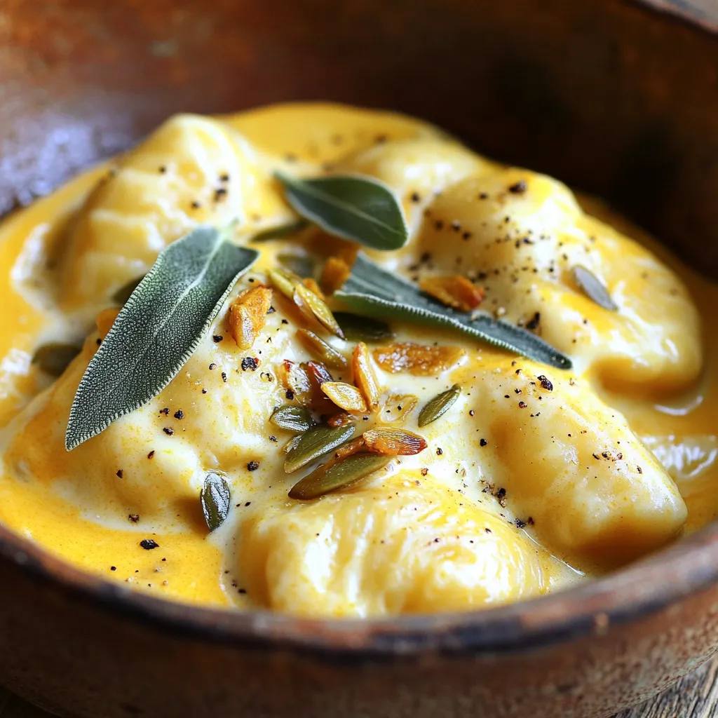 To make creamy pumpkin sage gnocchi, you'll need a few simple ingredients. Here’s what you should gather: - 1 pound store-bought gnocchi - 1 cup pure pumpkin puree (canned or fresh) - 1 cup heavy cream - 1/2 cup freshly grated Parmesan cheese - 2 tablespoons unsalted butter - 2 cloves garlic, finely minced - 10 fresh sage leaves, finely chopped - 1/2 teaspoon freshly grated nutmeg - Salt and freshly ground black pepper to taste - Toasted pumpkin seeds for garnish (optional) These ingredients create a rich and creamy sauce that pairs well with the soft gnocchi. The pumpkin gives a warm, earthy flavor, while the sage adds a nice touch of freshness. The Parmesan cheese makes the sauce extra smooth and cheesy. Using store-bought gnocchi saves time, but you can make your own if you prefer. The heavy cream ensures the sauce stays creamy. If you can find fresh sage, it will elevate your dish. Don’t forget the nutmeg; it adds a warm spice that enhances the pumpkin flavor. Gather these items, and you are ready to cook a delicious fall dish! Start by bringing a large pot of salted water to a boil. You want the water to be bubbling vigorously. Once boiling, add 1 pound of store-bought gnocchi. Cook them for about 2-3 minutes. You know they are done when they float to the surface. This means they are ready. Carefully drain them and set aside. Next, grab a large skillet and set it over medium heat. Add 2 tablespoons of unsalted butter and let it melt until it foams. Then, stir in 2 cloves of finely minced garlic and 10 chopped fresh sage leaves. Sauté this mix for 1-2 minutes. You want to smell that fragrant garlic and crisp sage. Now, gradually add 1 cup of pure pumpkin puree and 1 cup of heavy cream to the skillet. Stir well and bring the sauce to a gentle simmer. This helps all the flavors blend nicely. It’s time to bring it all together. Carefully fold the drained gnocchi into the pumpkin sauce. Make sure each piece gets coated with that creamy goodness. Cook for an extra 2-3 minutes. Stir gently to heat everything evenly. You want every bite to be warm and flavorful. Enjoy the delightful smell filling your kitchen! - Proper boiling and treating gnocchi: Start with a large pot of salted water. Wait for a rolling boil before adding the gnocchi. They usually float when ready, which takes about 2-3 minutes. Be gentle when draining to keep them intact. - Avoiding overcooking the sauce: Cook the sauce on medium heat. Once you add the cream and pumpkin, keep an eye on it. Stir gently and let it simmer. Avoid boiling, as this can change the sauce's texture. - Garnishing ideas for the final dish: For a beautiful touch, sprinkle freshly cracked black pepper and more grated Parmesan on top. You can also add toasted pumpkin seeds for crunch and flavor. - Elevating flavor and appearance: A light drizzle of olive oil adds shine and richness. This simple step makes the dish look fancy and taste even better. - Issues with sauce consistency: If your sauce is too thick, add a splash of water or broth. If it's too thin, let it simmer longer to thicken. - Overcooking gnocchi and sauce: Overcooked gnocchi turns mushy. Keep an eye on them while cooking. For the sauce, simmer it gently, as high heat can change the creaminess. {{image_4}} If you want to change things up, try swapping heavy cream with almond milk. This makes the dish lighter but still creamy. You can also use Greek yogurt for a tangy twist. For cheese, instead of Parmesan, you can use pecorino or even goat cheese. Each offers a unique flavor that can change the dish significantly. To boost the taste, consider adding thyme or rosemary. These herbs pair well with pumpkin and sage. Just chop them finely and mix them in when you add the garlic. If you want more protein, try adding cooked chicken or sausage. This makes the dish heartier. Shrimp also works great if you want seafood. In fall, add roasted Brussels sprouts or butternut squash for extra veggies. They add great flavor and texture. If it's a holiday, consider mixing in cranberries for a sweet touch. For special occasions, you can top with crispy pancetta or fried sage leaves. This adds crunch and a burst of flavor that is sure to impress your guests. To keep leftovers fresh, store them in an airtight container. Place the container in the fridge right away. The gnocchi will stay good for about three days. After that, the sauce may lose its creaminess and flavor. When reheating gnocchi, use a skillet over medium heat. Add a splash of cream or broth to help the sauce. Stir gently until everything is warm. This keeps the sauce creamy. You can also use a microwave, but be cautious. Heat it in short bursts and stir in between. This way, you avoid overcooking. You can freeze the gnocchi, but the sauce is best fresh. If you freeze it, the texture may change. To freeze, place the cooled dish in a freezer-safe container. It lasts up to three months. To thaw, move it to the fridge overnight. Reheat it slowly on the stove with a splash of cream. This helps bring back the creamy texture. Gnocchi is a type of pasta. It is often made from potatoes, flour, and eggs. The dough is rolled and cut into small pieces. Some gnocchi uses ricotta cheese or semolina flour. You can find different types in stores, but potato gnocchi is the most common. Yes, you can use homemade gnocchi. Making it at home lets you control the flavors and texture. Homemade gnocchi is often softer and lighter. To make it, boil potatoes until soft. Then, mash them and mix in flour and egg. Roll the dough, cut into pieces, and form into small dumplings. You can cook them in the same way as store-bought gnocchi. To make this dish vegetarian, focus on the ingredients. You can skip any meat-based products. Use vegetable broth instead of chicken broth if needed. Ensure your cheese is made without animal rennet. You can replace butter with olive oil for a vegan option. Add more veggies like spinach or mushrooms for extra flavor. This recipe comb