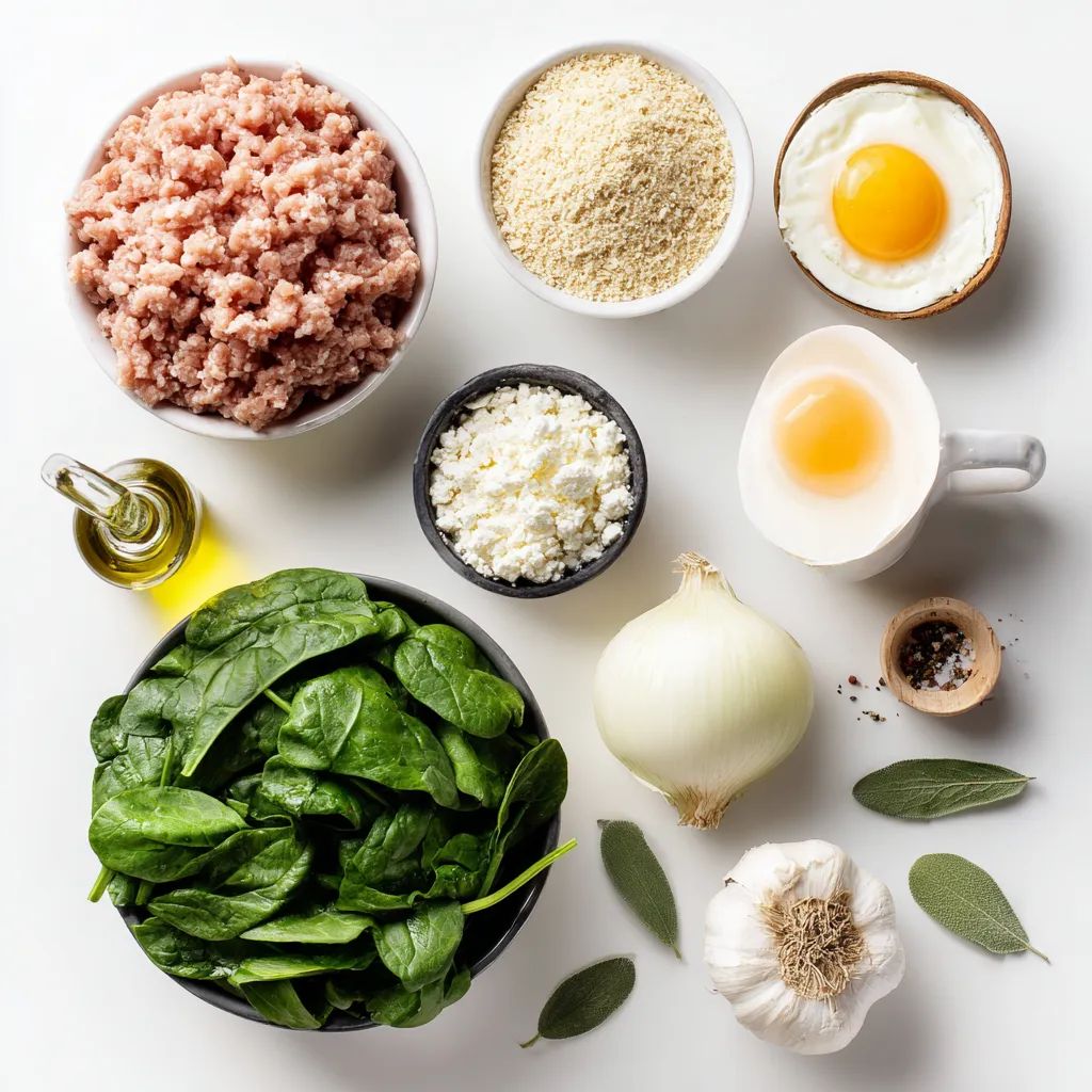 • In a spacious mixing bowl, blend together the ground turkey, finely chopped spinach, crumbled feta cheese, breadcrumbs, beaten egg, minced garlic, and finely chopped onion.