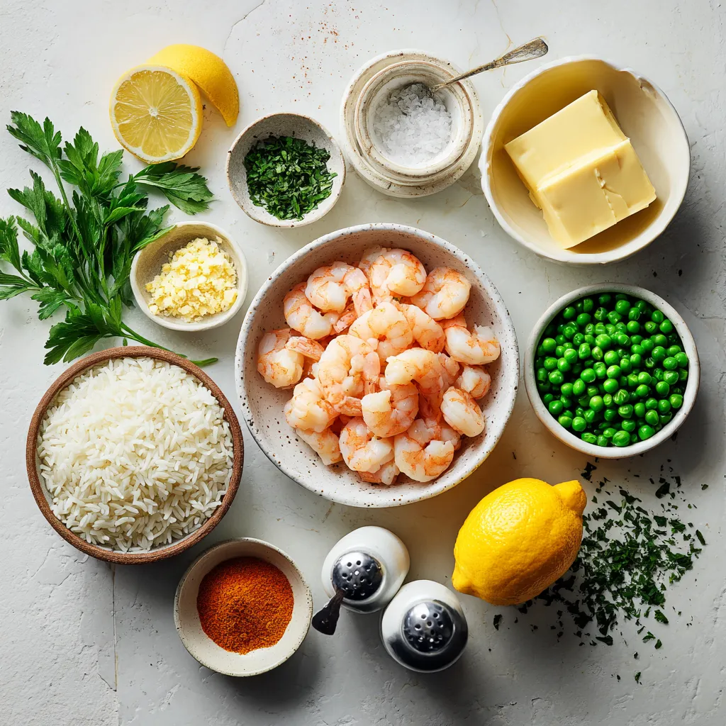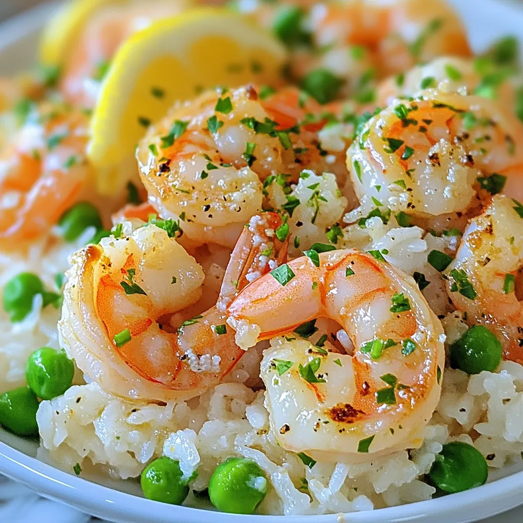 A delicious dish featuring succulent shrimp sautéed in garlic butter served over fluffy jasmine rice with green peas.