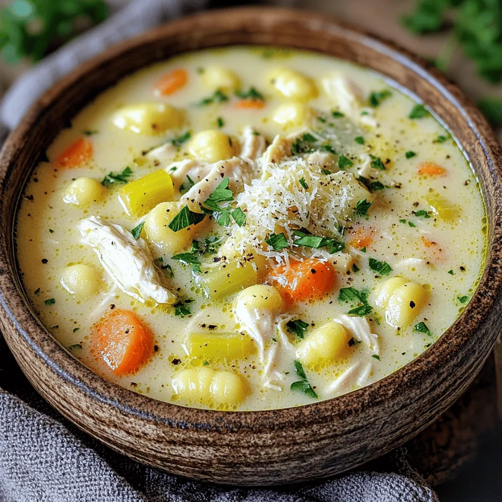 - 1 lb (450g) chicken breast, diced - 1 tablespoon olive oil - 4 cloves garlic, minced - 1 medium onion, chopped - 3 medium carrots, diced - 2 stalks celery, diced - 4 cups chicken broth - 1 cup heavy cream - 2 cups potato gnocchi - 1 cup fresh spinach, roughly chopped - 1 cup grated Parmesan cheese - 1 teaspoon dried thyme - 1 teaspoon dried oregano - Salt and black pepper, to taste - Fresh parsley, finely chopped for garnish I love using fresh ingredients in my Garlic Parmesan Chicken Gnocchi Soup. Fresh chicken makes the soup rich and tasty. Olive oil adds a nice flavor and helps cook the chicken. Garlic is a must; it gives the soup its special touch. Onions, carrots, and celery add great texture and taste. I always chop them small so they cook well. Chicken broth forms the base of the soup. It brings all the flavors together. Heavy cream adds thickness and creaminess. I prefer potato gnocchi for this soup. They are soft and absorb the flavors. Fresh spinach adds color and nutrients. Parmesan cheese makes everything creamy and cheesy. Thyme and oregano are my go-to herbs. They add warmth and depth. Finally, I like to season with salt and black pepper. A sprinkle of fresh parsley at the end brightens the dish. This soup is satisfying and full of flavor. You can switch the chicken for turkey or even tofu for a plant-based option. If you want a dairy-free soup, use coconut cream or cashew cheese. You can also make homemade gnocchi if you prefer. Store-bought works well for busy days. These swaps keep the soup fun and flexible! 1. Heat 1 tablespoon of olive oil in a large pot over medium heat. 2. Add 1 pound of diced chicken breast, seasoning with salt and pepper. 3. Sauté the chicken for about 5-7 minutes until browned and cooked through. 4. Remove the chicken and place it on a plate. 5. In the same pot, add 1 chopped onion, 3 diced carrots, and 2 diced celery stalks. 6. Sauté the vegetables for 5-6 minutes until they soften and the onion turns transparent. 7. Next, stir in 4 minced garlic cloves. Cook for 1-2 minutes until fragrant but not burnt. 1. Pour in 4 cups of chicken broth and raise the heat to a gentle boil. 2. Sprinkle in 1 teaspoon of dried thyme and 1 teaspoon of dried oregano, stirring well. 3. Carefully add 2 cups of potato gnocchi when the broth boils. 4. Reduce the heat and let the soup simmer for 3-4 minutes, until the gnocchi floats. 5. Lower the heat again and stir in 1 cup of heavy cream. 6. Add the cooked chicken, 1 cup of roughly chopped spinach, and 1 cup of grated Parmesan cheese. 7. Cook for another 2-3 minutes until the spinach wilts and the cheese melts. 1. Taste the soup and adjust the seasoning with salt and pepper as needed. 2. Ladle the soup into bowls, and garnish with finely chopped fresh parsley. 3. For an extra touch, add more grated Parmesan cheese on top. 4. Serve the soup with crusty bread for dipping to enhance the cozy feel. Best practices for browning chicken To get a nice brown color on your chicken, heat the olive oil in your pot until it shimmers. Then, add the diced chicken in a single layer. Don’t overcrowd the pot. This lets each piece get that lovely brown crust. Sear it for about 5-7 minutes until no longer pink. How to sauté vegetables for optimal flavor Sautéing vegetables is easy and fun! After cooking the chicken, use the same pot. Add chopped onion, diced carrots, and diced celery. Stir them for 5-6 minutes. This softens them and brings out their natural sweetness. Be sure the onion turns translucent for the best flavor. Achieving the perfect creamy texture To make your soup creamy, add heavy cream at the right time. Once the gnocchi are cooked, lower the heat. Stir in the cream slowly, then add the chicken and cheese. This helps create a rich, smooth soup that feels cozy. Preventing curdling when adding cream To avoid curdling, make sure the soup isn’t boiling when you add the cream. If it’s too hot, the cream can separate. Lower the heat to a gentle simmer and stir it in slowly. Pairing with sides (bread, salad) This soup is rich and filling. Pair it with crusty bread for dipping. A light salad with fresh greens also works well. This balances the meal and adds some crunch. Ideal serving temperatures Serve your soup hot, but not boiling. Let it cool a bit before serving. This way, you get all the flavors without burning your tongue! {{image_4}} You can easily change the vegetables in this soup. Try mushrooms or peas for a new twist. They add texture and flavor. You can also swap herbs for a fresh taste. Fresh basil, parsley, or dill work well. These swaps keep the soup exciting. If you need gluten-free options, look for gluten-free gnocchi. Many brands offer this choice now. For low-carb diets, consider using cauliflower gnocchi. It tastes great and fits your diet. These options let everyone enjoy the soup. Spices can take this soup to the next level. A pinch of red pepper flakes adds warmth. Paprika gives it a nice, smoky flavor. You can also add toppings like crispy bacon bits or fresh chives. These small touches make a big difference. They enhance both taste and presentation. To store leftover soup, cool it quickly. Place the soup in a shallow container. Cover it well with a lid or wrap. This keeps the soup fresh longer. Store it in the fridge for up to three days. When reheating, use a pot over low heat. Stir the soup often to keep it smooth. If it seems thick, add a splash of chicken broth or cream. This helps restore its creamy texture. For freezing garlic parmesan chicken gnocchi soup, let it cool first. Use freezer-safe containers to avoid leaks. Leave some space at the top for expansion. The soup can last in the freezer for about three months. To thaw, place the container in the fridge overnight. For a quicker method, set it in cold water. When ready to eat, reheat in a pot over low heat. Stir often, and add a bit of broth if it is too thick. In the fridge, the soup stays fresh for three days. In the freezer, it l