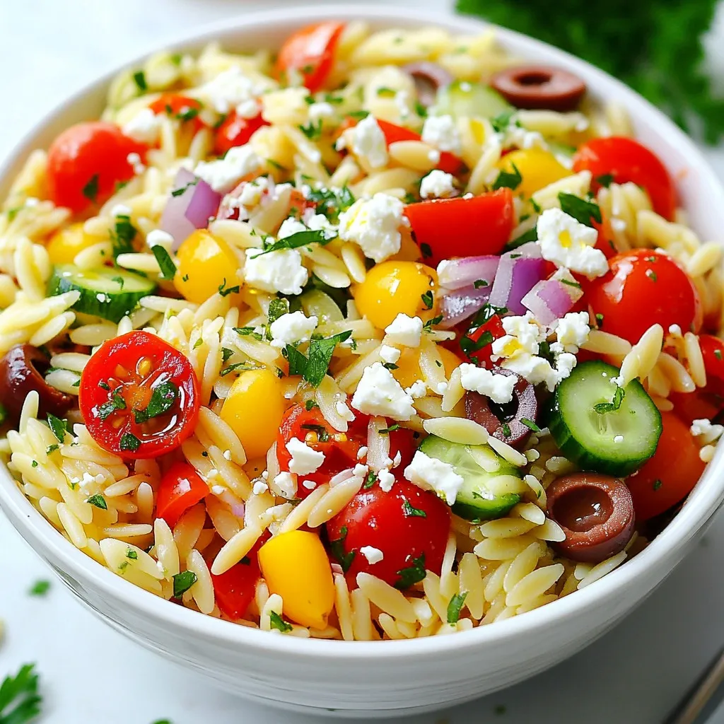 - 1 cup orzo pasta - 1 cup cherry tomatoes, halved - 1 cucumber, diced - 1 bell pepper (red or yellow), diced - 1/2 red onion, finely chopped - 1/2 cup Kalamata olives, pitted and sliced - 1/2 cup feta cheese, crumbled - 1/4 cup fresh parsley, chopped Greek Orzo Salad shines with its fresh and colorful ingredients. The orzo pasta serves as a lovely base. It cooks quickly and adds a nice texture. I love using cherry tomatoes for their sweet burst of flavor. Diced cucumbers add crunch and freshness. Bell peppers bring vibrant color and sweetness. Red onion gives a slight bite that balances the dish. Kalamata olives add a salty note. Crumbled feta cheese takes it to another level with its creamy richness. Fresh parsley brightens the flavors and looks beautiful. - 2 tablespoons extra virgin olive oil - 2 tablespoons freshly squeezed lemon juice - 1 teaspoon dried oregano - Salt and pepper to taste For the dressing, I use extra virgin olive oil for its fruity flavor. Freshly squeezed lemon juice gives the salad a zesty kick. Dried oregano adds a classic Mediterranean taste. Salt and freshly ground pepper enhance all the flavors. Together, these ingredients create a light and tangy dressing that ties the salad together perfectly. Understanding these ingredients helps you make the best Greek Orzo Salad. Each component plays a role in creating a fresh and flavorful dish. {{ingredient_image_2}} First, boil a pot of salted water. Add 1 cup of orzo pasta to the boiling water. Cook the orzo until it is al dente, following the package instructions. It should be firm but not hard. Once cooked, drain the orzo in a colander. Rinse it under cold running water. This stops the cooking. It also cools the pasta down quickly. In a large mixing bowl, combine the cooled orzo with fresh ingredients. Add 1 cup of halved cherry tomatoes, 1 diced cucumber, and 1 diced bell pepper. Next, add 1/2 finely chopped red onion and 1/2 cup of sliced Kalamata olives. Mix these ingredients gently. You want an even spread of all the fresh flavors. Finally, fold in 1/2 cup of crumbled feta cheese. Add 1/4 cup of chopped fresh parsley for a burst of color and taste. For the dressing, take a small bowl and whisk together 2 tablespoons of extra virgin olive oil and 2 tablespoons of freshly squeezed lemon juice. Add 1 teaspoon of dried oregano, along with salt and black pepper to taste. Whisk until the mixture is well blended. Drizzle this dressing over the salad. Toss everything gently to coat the orzo and veggies evenly. - Seasoning adjustments for taste: Always taste your salad before serving. If it needs more flavor, add salt or pepper. A little lemon juice can brighten it up too. You can also mix in extra oregano for a stronger herb taste. - Allowing time for flavors to meld: After mixing, cover the salad and chill it for at least 30 minutes. This wait lets all the flavors blend together. The result is a salad that tastes even better! - Serving suggestions for visual appeal: Use a large, shallow bowl to serve your salad. This way, everyone can see the bright colors of the veggies. It makes the dish look more inviting! - Garnishing ideas for a fresh look: Top your salad with extra crumbled feta and a sprinkle of fresh parsley. Just before you serve, drizzle a bit of olive oil and lemon juice on top. This adds shine and makes it look fresh, too! Pro Tips Use Fresh Ingredients: Fresh vegetables and herbs can significantly enhance the flavor of your Mediterranean Orzo Delight. Try to use seasonal produce for the best taste. Customize Your Protein: For a heartier version, consider adding grilled chicken or chickpeas. This will increase the protein content and make it a more filling meal. Make It Ahead: This salad tastes even better the next day as the flavors meld together. Prepare it a few hours or even the night before serving. Adjust the Dressing: Feel free to experiment with additional herbs or spices in the dressing, such as basil or garlic, to give it a unique twist that suits your palate. {{image_4}} You can swap in many fresh veggies for this Greek orzo salad. Try adding: - Spinach or arugula for a leafy crunch - Roasted red peppers for a smoky flavor - Zucchini for extra nutrition Mixing in different herbs can also add flavor. Consider using: - Fresh dill for a bright taste - Mint for a refreshing twist If you want to change the cheese, feta is great, but others can work too. Try: - Goat cheese for a tangy flavor - Mozzarella for a milder taste - Parmesan for a nutty touch For gluten-free options, use gluten-free orzo or other gluten-free pasta. Brown rice or quinoa also makes a great base. If you're looking for vegetarian choices, this salad is already meat-free. To make it vegan, swap feta for: - Crumbled tofu with lemon juice - Vegan cheese alternatives You can replace honey in the dressing with maple syrup for a vegan touch. Enjoy these tasty variations! Greek Orzo Salad is a great dish to store. It lasts about three to four days in the fridge. For best results, keep it in an airtight container. This helps keep it fresh and tasty. You can enjoy this salad cold or at room temperature. If you have leftovers, take them out and let them sit for a bit. This brings back some of the fresh taste. If the flavors seem dull, add a splash of olive oil or lemon juice. This small change can make a big difference! To make Greek Orzo Salad vegan, start by replacing the feta cheese. Use a plant-based feta or omit it entirely. For the dressing, ensure the olive oil and lemon juice are vegan-friendly. You can also add a splash of apple cider vinegar for added flavor. Yes, you can use other pasta types if you prefer. Small shapes like quinoa, couscous, or even small shells work well. Each option brings a unique texture to the salad. Serve the Greek Orzo Salad chilled or at room temperature. It pairs perfectly with grilled chicken or fish. You can also enjoy it as a stand-alone dish. For a nice touch, top it with extra feta and a drizzle o