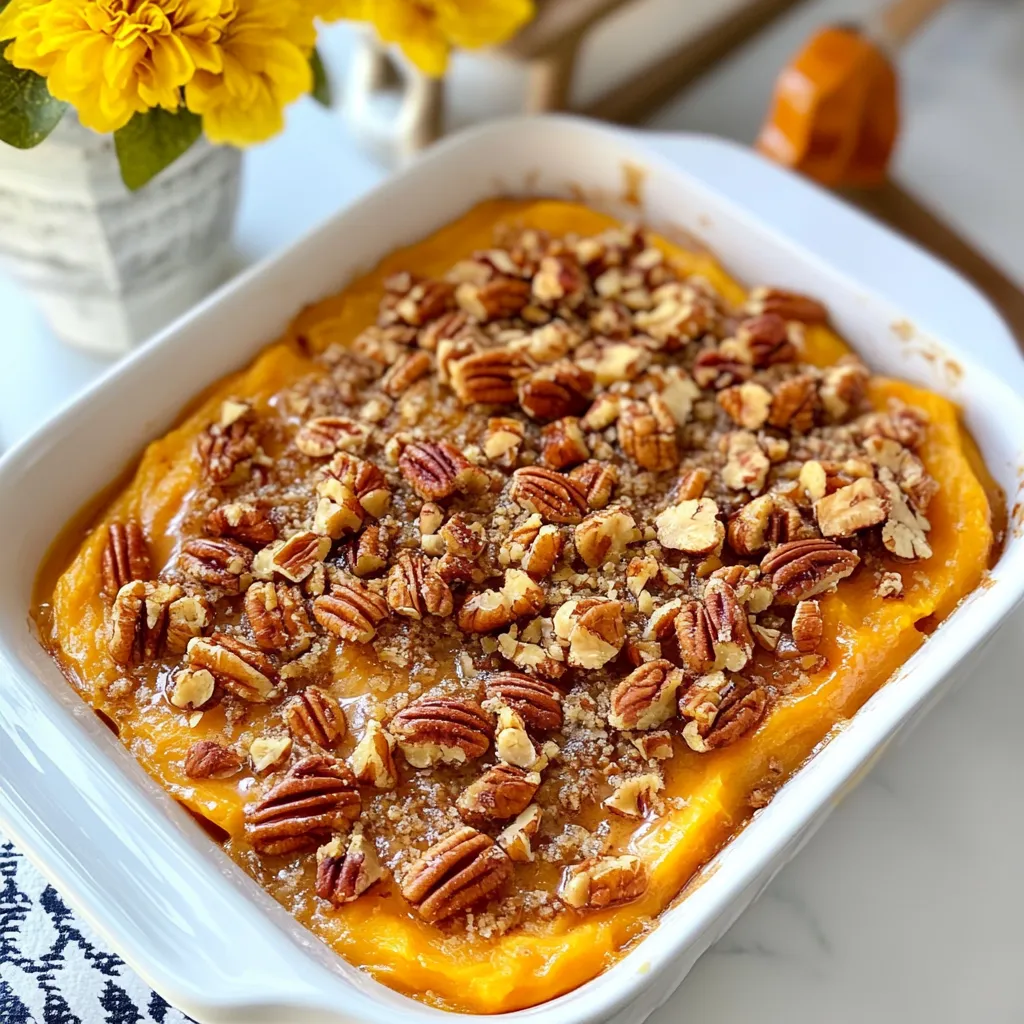 To make the Maple Pecan Sweet Potato Casserole, you will need the following fresh and tasty ingredients: - 4 large sweet potatoes, peeled and cubed - 1/2 cup pure maple syrup - 1/4 cup unsalted butter, melted - 1/2 cup milk (or any plant-based milk of your choice) - 1 teaspoon pure vanilla extract - 1/2 teaspoon ground cinnamon - 1/4 teaspoon ground nutmeg - Salt, to taste - 1 cup pecans, roughly chopped - 1/2 cup packed brown sugar - 1/4 cup all-purpose flour - 2 tablespoons melted butter (for the topping) Each ingredient plays a key role. The sweet potatoes give a creamy base, while maple syrup adds sweetness. Butter gives richness, and milk makes it smooth. Vanilla and spices boost the flavor. Pecans provide crunch, and brown sugar adds caramel notes. Flour helps bind the topping together. Together, they create a delightful dish that everyone will love. Enjoy gathering these ingredients! {{ingredient_image_2}} First, preheat your oven to 375°F (190°C). This step is key to a good bake. Next, take your four large sweet potatoes. Peel and cube them. Place the cubes in a large pot and cover them with water. Bring the water to a boil over medium-high heat. Cook the sweet potatoes for about 15-20 minutes. They should be tender when done. Drain them well, then return them to the pot. Use a potato masher or a fork to mash the sweet potatoes. Aim for a smooth, creamy texture. Add in 1/2 cup of pure maple syrup, 1/4 cup of melted butter, and 1/2 cup of milk. You can use any plant-based milk if you prefer. Mix in 1 teaspoon of pure vanilla extract, 1/2 teaspoon of ground cinnamon, 1/4 teaspoon of ground nutmeg, and a sprinkle of salt. Stir until everything is well combined and creamy. Lightly grease a 9x13 inch baking dish. Scoop the sweet potato mixture into the dish. Use a spatula to spread it out evenly. In a separate bowl, combine 1 cup of roughly chopped pecans, 1/2 cup of packed brown sugar, and 1/4 cup of all-purpose flour. Add 2 tablespoons of melted butter and stir until the pecans are coated. Sprinkle the pecan topping evenly over the sweet potato layer. Place the casserole in the preheated oven. Bake it for 25-30 minutes. Look for a golden-brown topping and ensure the casserole is hot throughout. Once it is done baking, carefully take the casserole out of the oven. Let it rest for a few minutes before serving. This rest time helps it set up nicely. To get a smooth mix, mash the sweet potatoes well. Use a potato masher or fork. Make sure there are no lumps. If you want it creamier, add more milk. You can also use a blender for a silkier texture. Just blend it slowly to avoid over-mixing. You can swap some ingredients for a healthier dish. Use coconut oil instead of butter. This will add a nice flavor and cut calories. You can also replace brown sugar with maple sugar or coconut sugar. For a dairy-free option, use almond or oat milk instead of regular milk. Add a pinch of cayenne or ginger for a spicy twist. You can also mix in some orange zest for a bright taste. If you love chocolate, sprinkle mini chocolate chips on top before baking. This adds a fun surprise and rich flavor. Each of these changes will make your dish unique and tasty. Pro Tips Choose the Right Sweet Potatoes: Opt for firm, smooth-skinned sweet potatoes for the best texture and flavor in your casserole. Make Ahead Option: You can prepare the sweet potato mixture a day in advance, just cover and refrigerate it. Add the topping before baking. Customize Your Topping: Feel free to add oats or even shredded coconut to the pecan topping for extra texture and flavor. Perfect Baking: Keep an eye on the casserole while it bakes; if the topping browns too quickly, cover it loosely with aluminum foil. {{image_4}} You can make this dish vegan easily. Just use plant-based milk for the recipe. Swap the butter with coconut oil or vegan butter. Use maple syrup as your sweetener. This keeps the dish rich and sweet. You won’t miss the dairy at all! To make this casserole gluten-free, choose gluten-free flour. You can find many brands that work well. Ensure your maple syrup is pure, as some may have additives. The rest of the ingredients are naturally gluten-free, so you’re in good shape. Pecans are great, but feel free to mix it up! Try walnuts or almonds for a different flavor. You can even combine nuts for a tasty crunch. Just make sure to chop them well. This will give your casserole a nice texture and taste. Once you finish your Maple Pecan Sweet Potato Casserole, store any leftovers in an airtight container. Make sure to let the casserole cool to room temperature first. You can keep it in the fridge for up to five days. If you want to keep it longer, freezing is a great option. To reheat, preheat your oven to 350°F (175°C). Place the casserole in a baking dish and cover it with foil. Heat for about 20 minutes or until warmed through. If you want a crunchy topping again, remove the foil during the last five minutes of heating. If you want to freeze the casserole, do it before baking. Prepare the dish as usual, then cover it tightly with plastic wrap and foil. You can freeze it for up to three months. When ready to bake, thaw overnight in the fridge before cooking. Then, bake as directed, adding a few extra minutes if needed. Yes, you can prepare this casserole ahead of time. After mixing the sweet potato filling, place it in the baking dish. Cover it tightly with plastic wrap. Store it in the fridge for up to 24 hours. When ready to bake, just add the topping and bake as directed. This casserole pairs well with many dishes. Try serving it with roasted turkey, glazed ham, or a simple green salad. You can also add cranberry sauce for a tart contrast. This dish shines at holiday dinners and festive meals alike. Leftovers can last in the fridge for about 3 to 5 days. Store them in an airtight container to keep them fresh. Reheat portions in the microwave or oven until warm. You can enjoy this dish several days after the first s