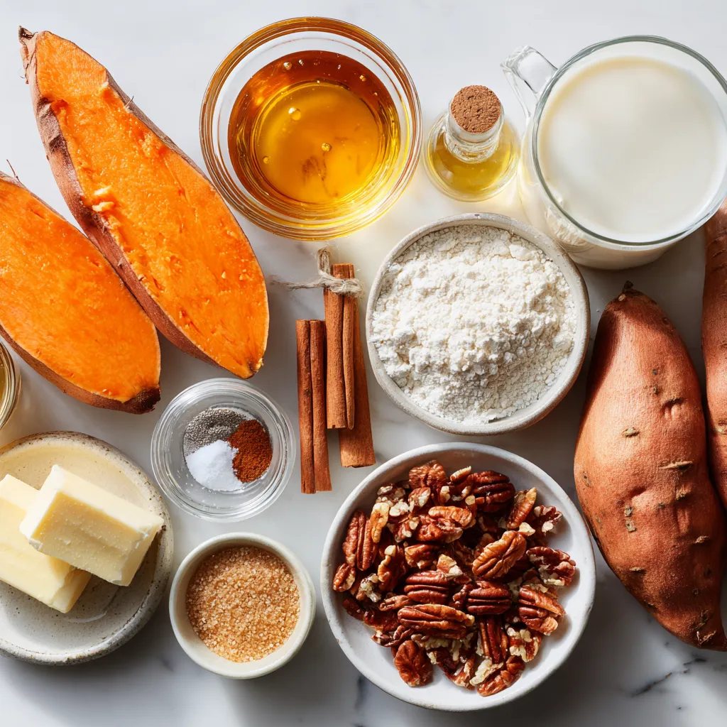 Each ingredient plays a key role. The sweet potatoes give a creamy base, while maple syrup adds sweetness. Butter gives richness, and milk makes it smooth. Vanilla and spices boost the flavor. Pecans provide crunch, and brown sugar adds caramel notes. Flour helps bind the topping together. Together, they create a delightful dish that everyone will love. Enjoy gathering these ingredients!