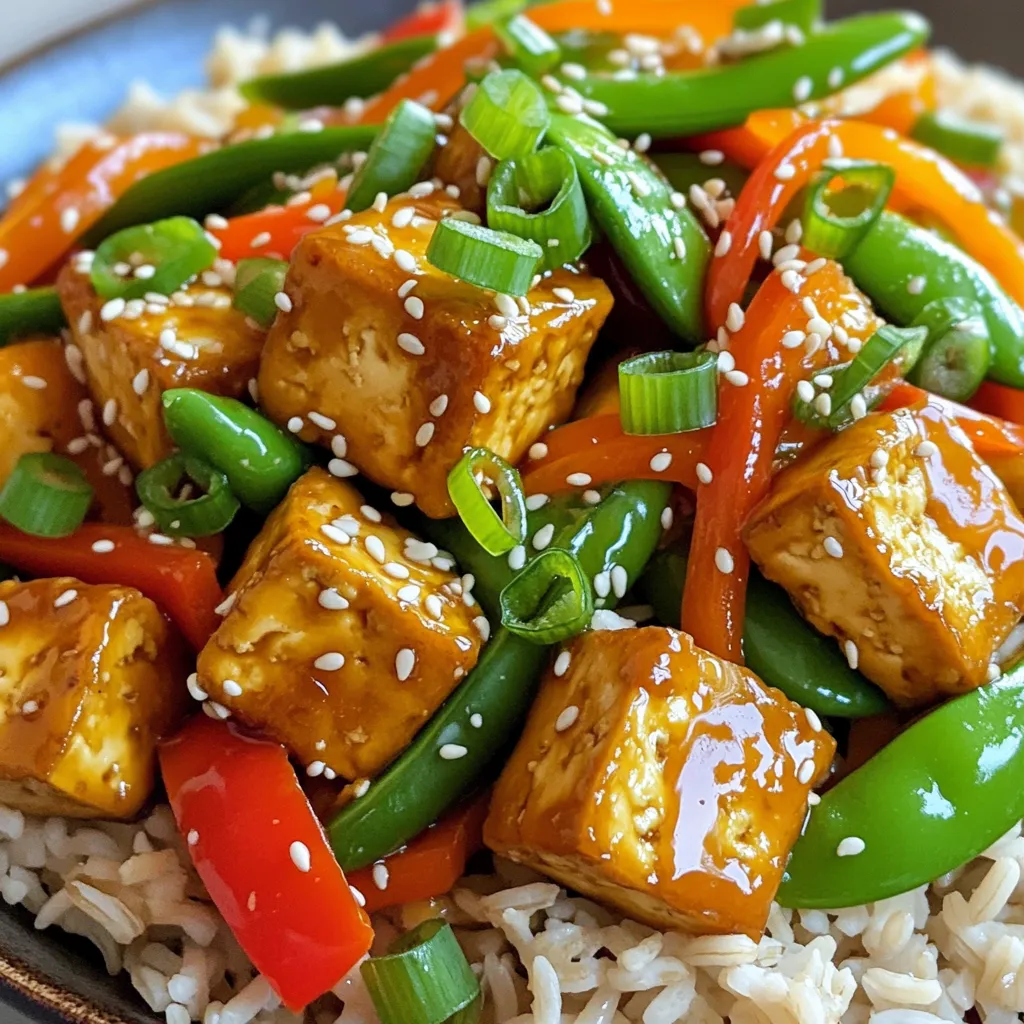 - 14 oz firm tofu, drained and pressed - 1 tablespoon fresh ginger, grated - 1 bell pepper, sliced (any color) - 1 cup snap peas, trimmed - 1 carrot, julienned The main ingredients create the base of our Minute Sesame Ginger Tofu Stir-Fry. Firm tofu gives a nice texture and absorbs flavors well. Fresh ginger adds a warm, spicy kick. The vegetables bring color and crunch, making every bite exciting. - 2 tablespoons sesame oil - 2 tablespoons soy sauce (or tamari for gluten-free) - 2 cloves garlic, minced - 1 tablespoon sesame seeds The seasonings and oils are key to flavor. Sesame oil adds a rich, nutty taste. Soy sauce or tamari brings saltiness and depth. Garlic offers aroma and warmth, while sesame seeds give a delightful crunch and nutty finish. - Cooked brown rice - Quinoa Serving this stir-fry over brown rice or quinoa enhances the meal. Both options provide a hearty base. They soak up the tasty sauce, adding more flavor to each bite. Plus, rice and quinoa are nutritious, making your dish even better. - Draining and Pressing First, drain the firm tofu. Wrap it in a clean kitchen towel. Place a heavy pan on top. Let it sit for about 10 minutes. This step removes excess water and helps the tofu crisp up. - Cutting into Bite-Sized Cubes After pressing, cut the tofu into small cubes. Aim for even sizes. This ensures they cook evenly and get that nice golden crust. - Heating the Sesame Oil Next, heat the sesame oil in a large skillet over medium-high heat. Wait until it shimmers. This means it’s hot enough for the tofu. - Achieving a Golden Brown Tofu Crust Add the tofu cubes to the hot oil. Let them cook without stirring for about 5 minutes. Turn them gently with a spatula. You want all sides to be golden brown and crispy. - Incorporating Ginger and Garlic Once the tofu is golden, add the grated ginger and minced garlic. Stir continuously for about a minute. This releases amazing aromas that boost the flavor. - Stir-Frying Vegetables to Perfection Now, add the sliced bell pepper, snap peas, and julienned carrot. Stir-fry for 3 to 4 minutes. You want the veggies bright and just tender. They should still have a nice crunch. After adding soy sauce, finish with green onions and sesame seeds. Enjoy the lovely balance of flavors! Best Method to Achieve Crispiness To get crispy tofu, use firm or extra-firm tofu. Start with draining and pressing it to remove excess water. This step is key for texture. Next, cut the tofu into bite-sized cubes. Heat sesame oil in a hot skillet. Add the tofu and cook until golden brown on all sides. This method gives a nice crunch. Avoiding Common Mistakes Avoid overcrowding the pan. If you add too much tofu at once, it will steam instead of fry. Turn the tofu only when it forms a crust. This helps it stay intact and crispy. Adding Extra Seasonings Boost flavor with extra seasonings. A splash of soy sauce or tamari enhances umami. Consider adding chili flakes for heat or a dash of rice vinegar for tang. These small tweaks can elevate your dish. Using Fresh Herbs for Garnish Fresh herbs add brightness. Use chopped green onions or cilantro as a garnish. They provide a fresh taste and vibrant color. Just sprinkle them on top before serving for a pop of flavor. Serving Suggestions Serve the stir-fry in shallow bowls. This highlights the colorful mix of veggies and tofu. Place a lemon wedge on the side. When squeezed, it adds a fresh burst of flavor. Decorative Garnishes Garnish with extra sesame seeds for a nutty touch. You can also add more green onion for a splash of color. These small details make your dish look appetizing and inviting. {{image_4}} Tempeh as an Alternative Using tempeh can add a different texture. Tempeh is fermented soy. It has a nutty taste. Cut it like tofu and cook it the same way. This change boosts protein and adds flavor. Adding Edamame or Chickpeas Edamame or chickpeas can be great add-ins. They bring more protein and fiber. Add a cup of either to your stir-fry. Mix them in when you add the veggies. This provides a nice crunch and health boost. Seasonal Vegetable Ideas You can swap in seasonal vegetables. Use zucchini in summer or squash in fall. Broccoli or bok choy work well, too. This keeps your dish fresh and exciting. Customizing Based on Preferences Feel free to customize based on your likes. If you love mushrooms, toss those in. Prefer leafy greens? Add spinach or kale. The stir-fry is all about your taste. Incorporating Spices or Chili Flakes Want more heat? Add chili flakes or sriracha. This gives your dish a spicy kick. You can also try adding cumin or coriander for extra depth. Using Different Oils or Sauces Try different oils like avocado or peanut oil. Each oil brings its own taste. You can also switch the soy sauce for teriyaki or coconut aminos. This makes each stir-fry unique. To keep your Minute Sesame Ginger Tofu Stir-Fry fresh, store it in an airtight container. This method helps retain flavor and texture. You can keep it in the fridge for up to three days. Just make sure it cools down before sealing. This prevents condensation and sogginess. If you want to save some for later, freezing works well. Let the stir-fry cool completely before packing it in freezer-safe bags. Squeeze out as much air as possible to prevent freezer burn. It can last in the freezer for up to three months. When you're ready to enjoy it, thaw it overnight in the fridge. Reheat in a skillet over medium heat until warmed through, or use a microwave. Preparing ingredients ahead of time can make cooking easier. Chop the vegetables and store them in separate containers. You can even cube the tofu and marinate it with sesame oil and soy sauce for extra flavor. For leftovers, pack them in single-serving containers. This makes it simple to grab a meal anytime, keeping your meals quick and tasty. This dish takes about 20 minutes to cook. You will spend 10 minutes preparing the ingredients. The cooking time is just 10 minutes. This quick recipe is great for