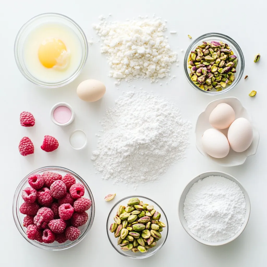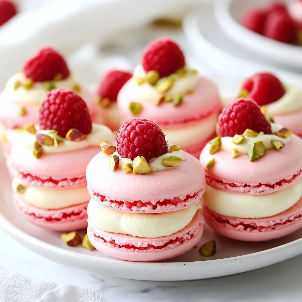 - 120g almond flour - 200g powdered sugar - 100g egg whites (about 3 large eggs), at room temperature - 30g granulated sugar - A pinch of salt - Pink gel food coloring (optional) - 50g shelled pistachios, finely chopped (plus extra for garnish) - 1 cup fresh raspberries (for filling) - 1 cup unsalted butter, softened at room temperature - 2 cups powdered sugar (for the buttercream filling) - 1 teaspoon vanilla extract Almond flour is the star of the macaron shell. It gives the shells their unique texture and flavor. Make sure it is finely ground. Powdered sugar adds sweetness and helps create that smooth surface we love. Egg whites are crucial for structure. They provide lift and create the airy texture. Granulated sugar helps stabilize the egg whites, giving them strength. The pinch of salt balances the sweetness. Pink gel food coloring brightens the look, making your macarons pop! Pistachios add crunch and a lovely nutty flavor. Fresh raspberries bring freshness to the buttercream filling. The butter and powdered sugar make a creamy, dreamy filling, while vanilla extract adds depth. Consider adding pink gel food coloring for a splash of color. A few drops will do the trick. You can also use raspberry puree in the buttercream. This adds a fruity twist and enhances the raspberry flavor. Extra finely chopped pistachios can be used for garnishing. They not only look pretty but also add a nice crunch! {{ingredient_image_2}} Start by preheating your oven to 300°F (150°C). Line two baking sheets with parchment paper or silicone mats. This helps prevent sticking and makes cleanup easy. In one bowl, sift together 120g of almond flour and 200g of powdered sugar. This step removes lumps. In another bowl, whisk 100g of egg whites with a pinch of salt until they foam. Gradually add 30g of granulated sugar. Keep whisking until stiff peaks form. If you want color, add a few drops of pink gel food coloring. Use a rubber spatula to fold the sifted almond flour and powdered sugar into the egg whites. Use a figure-eight motion to mix gently. Stop when the batter flows like lava from the spatula. Be careful not to overmix, as this can ruin the texture. Transfer the batter to a piping bag with a round tip. Pipe small, even circles on the prepared sheets. Leave space between each macaron. Tap the sheets on the counter to remove air bubbles. Let them sit at room temperature for 30-60 minutes until the tops feel dry. Once the tops are dry, place the macarons in the oven. Bake for 15-20 minutes. They should feel firm and have “feet” at the base. Let them cool completely on the sheets before removing them. In a bowl, beat 1 cup of softened unsalted butter until creamy. Gradually mix in 2 cups of powdered sugar until fluffy. Add 1 teaspoon of vanilla extract. For extra flavor, you can fold in some raspberry puree at this stage. Choose half of the macaron shells and flip them over. Pipe a dollop of buttercream on each upside-down shell. Add a couple of fresh raspberries on top. Gently press another shell on top to make a sandwich. For a beautiful finish, sprinkle finely chopped pistachios around the edges of the assembled macarons. This adds flavor and a nice touch to your treats. To make a perfect macaron shell, follow these steps closely: - Sift your dry ingredients: Always sift the almond flour and powdered sugar together. This step removes lumps. It also creates a smooth batter. - Egg whites matter: Use room-temperature egg whites. They whip better and create more volume. - Whisk until stiff peaks: When you whisk, stop when the egg whites are glossy and hold their shape. This is key for macaron success. - Don’t overmix: When you fold in the dry mix, use a gentle figure-eight motion. Stop when the batter flows like lava. Overmixing can ruin the texture. Here are some mistakes to steer clear of: - Skipping the resting step: Allow the piped macarons to rest until they dry. This helps form the crust. - Not tapping the baking sheet: Always tap the sheets after piping. This helps remove air bubbles. - Opening the oven door: Resist the urge to peek while baking. This can cause the macarons to crack. - Incorrect oven temperature: Use an oven thermometer to ensure the right heat. Macarons bake best at 300°F (150°C). Having the right tools makes a big difference: - Mixing bowls: Use two bowls—one for dry and one for wet ingredients. - Piping bags: A disposable piping bag with a round tip works best for neat shells. - Baking sheets: Use two sheets lined with parchment or silicone mats for easy macaron removal. - Sifter: A fine-mesh sifter is crucial for sifting the almond flour and powdered sugar. - Oven thermometer: This ensures your oven is at the right temperature for baking. These tips and tricks will help you craft beautiful Raspberry Pistachio Macarons. Enjoy the process! Pro Tips Room Temperature Egg Whites: Ensure your egg whites are at room temperature for better volume. This helps achieve the stiff peaks necessary for the perfect macaron structure. Resting the Macarons: Allow the piped macarons to rest until they form a skin before baking. This crucial step helps develop the signature "feet" and prevents cracking. Oven Calibration: Every oven is different; consider using an oven thermometer to ensure you're baking at the correct temperature for consistent results. Flavor Variations: Experiment with fillings! You can incorporate other fruits or flavored extracts into the buttercream for a unique twist on these raspberry pistachio macarons. {{image_4}} You can change the flavors in raspberry pistachio macarons. Try lemon or chocolate fillings. To make lemon macarons, use lemon zest and juice in the buttercream. For chocolate, add cocoa powder to the buttercream. You can also swap pistachios for other nuts like almonds or hazelnuts. Adjust the nut flavor to fit your taste. You can make these macarons gluten-free and dairy-free. Use almond flour as your base, which is naturally gluten-free. For a dairy
