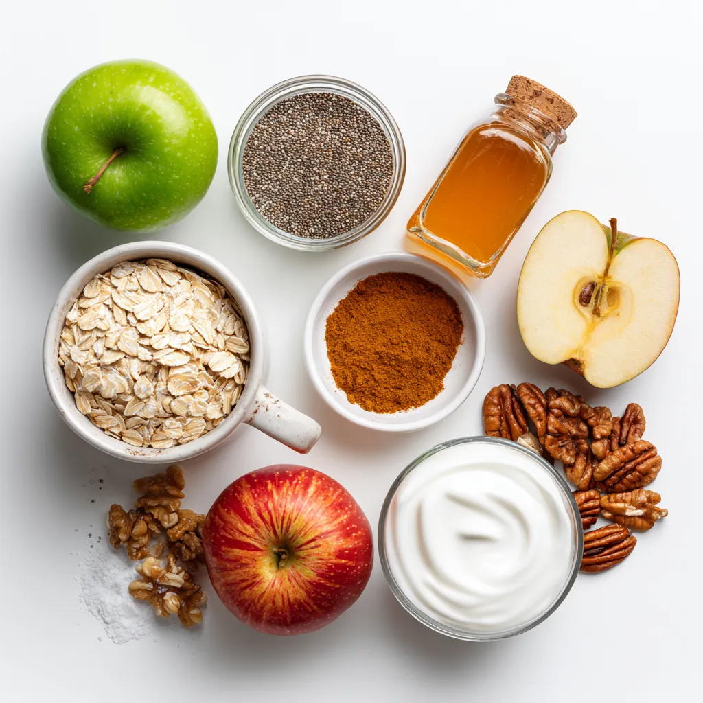 These ingredients form a simple and tasty base for your overnight oats. Rolled oats give a hearty texture, while almond milk keeps it light. Grated apple adds natural sweetness and flavor. Ground cinnamon brings warmth, and a pinch of salt enhances the taste. Chia seeds help thicken the mix and add healthy fiber. You can choose to add Greek yogurt if you want a creamier texture. Top it all off with chopped nuts and apple slices for a crunchy finish. This combo makes every bite satisfying and delicious.
