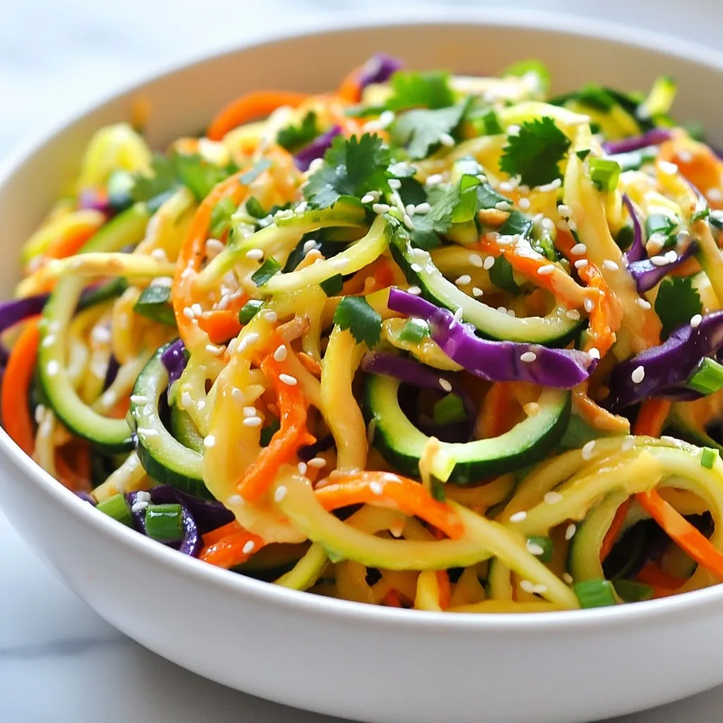A refreshing salad featuring spiralized zucchini noodles, colorful vegetables, and a creamy peanut dressing.