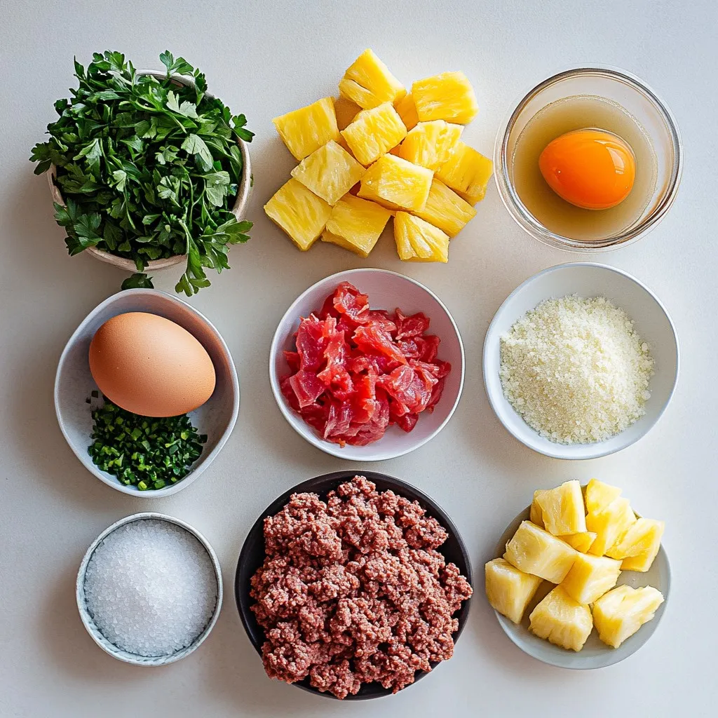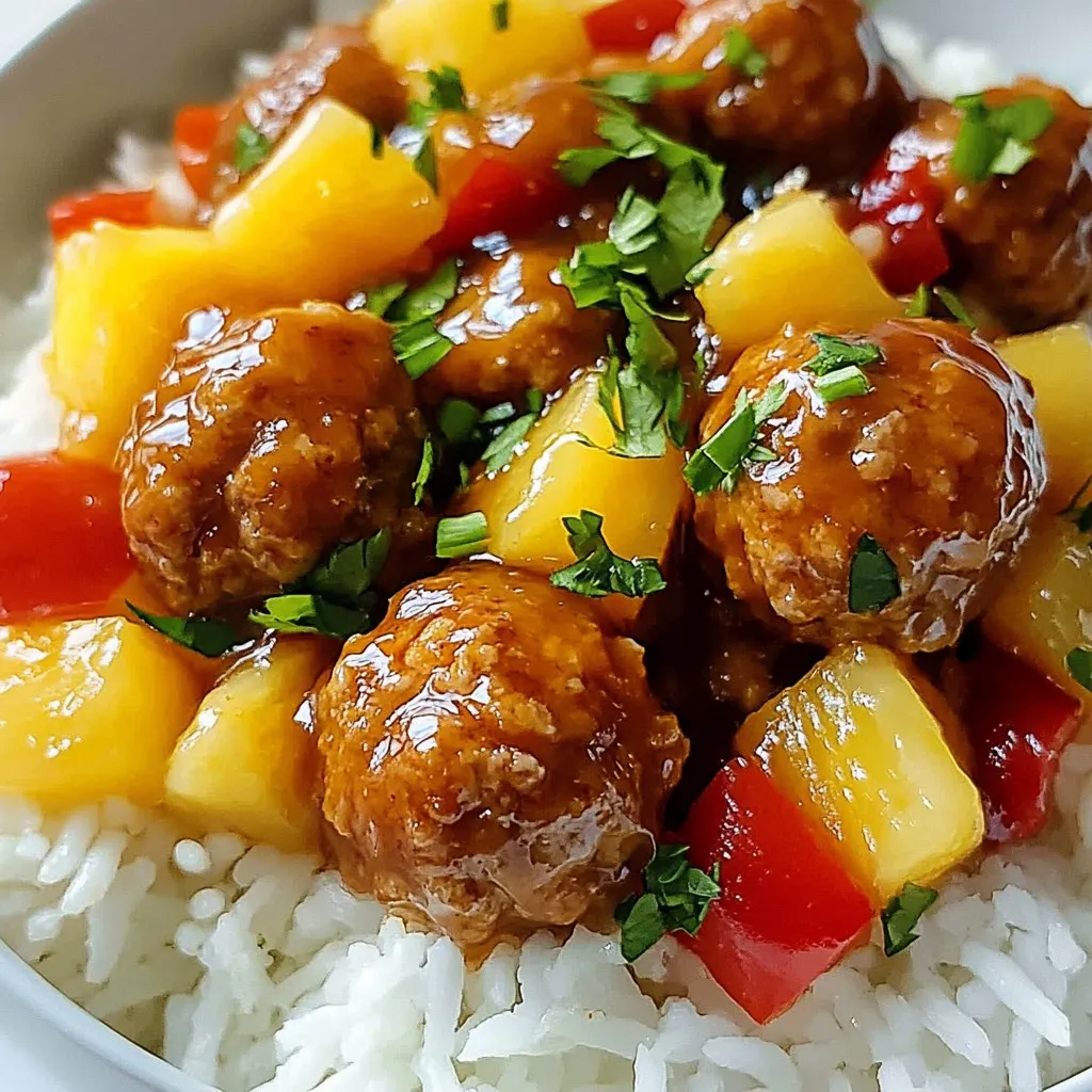 - 1 lb ground beef (or ground turkey) - 1/2 cup breadcrumbs (seasoned for extra flavor) - 1/4 cup grated Parmesan cheese - 1/4 cup fresh parsley, finely chopped - 1 large egg - 1 teaspoon garlic powder - 1 teaspoon onion powder - Salt and freshly ground pepper, to taste I love using ground beef for its rich flavor, but ground turkey works great too. The breadcrumbs add texture, while the Parmesan gives a lovely cheesy taste. Fresh parsley brightens the meatballs and adds color. Garlic and onion powders offer a savory kick, which is essential for flavor. - 1 cup juicy pineapple chunks (fresh or canned) - 1 red bell pepper, cut into bite-sized pieces - 1/2 cup onion, finely chopped - 1/2 cup granulated sugar - 1/2 cup apple cider vinegar - 1/4 cup soy sauce (low-sodium if preferred) - 1 tablespoon cornstarch mixed with 2 tablespoons water (for thickening) The sweet and sour sauce is the star of this dish. Pineapple chunks bring sweetness and tang, while the bell pepper and onion add crunch. Sugar balances the vinegar's acidity and gives a sweet taste. Soy sauce deepens the flavor, and cornstarch helps thicken the sauce, making it cling to the meatballs. {{ingredient_image_2}} In a large bowl, mix the ground beef, breadcrumbs, grated Parmesan, and parsley. Add the egg, garlic powder, onion powder, salt, and pepper. Use your hands to blend everything well. This helps the flavors spread evenly. If the mixture feels too wet, add a bit more breadcrumbs. If it's too dry, add a splash of water. You want it to stick together but not be too wet. Now, roll the mixture into small balls, about 1 inch wide. This size cooks evenly and is easy to eat. Place the meatballs on a baking sheet lined with parchment paper. Make sure to leave space between them so they can brown. Preheat your oven to 400°F (200°C). Bake for 20 to 25 minutes until they turn golden brown and are cooked through. While the meatballs bake, let's make the sauce. In a medium saucepan, combine the sugar, apple cider vinegar, and soy sauce. Also, add the cornstarch mixed with water. Stir well to blend everything. This will be the base of your sauce. Place the saucepan on medium heat. Bring the mixture to a boil while stirring often. You want it to thicken, which should take about 3 to 5 minutes. The sauce should coat the back of a spoon when it's ready. If it gets too thick, add a little water to loosen it up. Once the sauce thickens, stir in the pineapple chunks, chopped red bell pepper, and onion. Cook this for about 5 to 7 minutes. The veggies should soften but still have a bit of crunch. Finally, add the baked meatballs to the sauce. Gently stir to coat each meatball. Let them simmer for 2 to 3 minutes to meld the flavors. Enjoy your sweet and sour meatballs over rice for a tasty meal! To get the best meatballs, ensure they cook evenly. - Roll the meatballs to about 1 inch in size. - Place them on a baking sheet with space between each ball. - Bake at 400°F for 20-25 minutes. This helps them brown nicely. To avoid dry meatballs, don’t overmix. - Mix just until combined. - Adding breadcrumbs and an egg keeps them moist. You can adjust the sauce sweetness easily. - Add more sugar for a sweeter taste. - Use less vinegar for a milder flavor. Fresh ingredients make a big difference. - Opt for ripe pineapple chunks. - Use fresh bell pepper and onion for crispness. Pair your meatballs with fun side dishes. - Fluffy steamed rice is a great match. - Serve with crunchy stir-fried veggies for added color. For presentation, think about how to make it pop. - Garnish with green onions or parsley. - Arrange meatballs on a colorful plate for a feast for the eyes. Pro Tips Use Fresh Ingredients: Always opt for fresh pineapple and bell peppers for a burst of flavor and vibrant color in your dish. Mix Thoroughly: Ensure that all ingredients in the meatball mixture are well combined for even flavor distribution throughout the meatballs. Control the Sauce Thickness: Keep an eye on the sauce while it thickens; you can add a bit more water if it becomes too thick for your liking. Serve Immediately: For the best texture and taste, serve the sweet and sour meatballs right after cooking for a delightful dining experience. {{image_4}} You can use ground turkey or chicken instead of beef. These options reduce fat and calories. They keep the meatballs juicy and flavorful. For the sauce, try low-sugar versions. You can use honey or maple syrup for sweetness. Both add a nice taste without the extra sugar. You can explore using pork for a richer flavor. Vegetarian meatballs are also a great choice. Use black beans, lentils, or chickpeas as the base. Each option brings a unique taste and texture. You can also play with flavors from different cuisines. Think about adding spices like cumin or coriander for a twist. Don’t be afraid to get creative with the sauce. Try adding fruits like mango or apricot for sweetness. You can also toss in vegetables like carrots or zucchini. This makes the dish even more colorful and healthy. Experiment with spices and herbs, too. A pinch of ginger or chili flakes can add a nice kick. To store your sweet and sour meatballs, let them cool first. Place them in an airtight container. This method helps keep them fresh. You can refrigerate them for up to three days. For longer storage, freeze the meatballs. Use a freezer-safe bag or container, and remove as much air as you can. They can last up to three months in the freezer. When reheating, you want to keep the flavor intact. One good method is to use the oven. Preheat it to 350°F (175°C). Place the meatballs in a baking dish covered with foil. Heat for about 15-20 minutes. You can also use the microwave. Heat the meatballs in 30-second bursts. Check if they are hot throughout. In the fridge, sweet and sour meatballs last about three days. If they sit longer, they may spoil. Look for signs like an off smell or any mold. If you see these signs, it’s best to discard them. Always tr