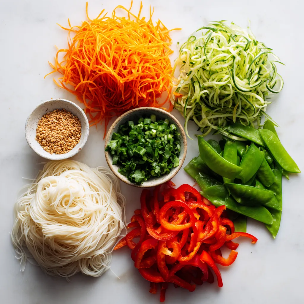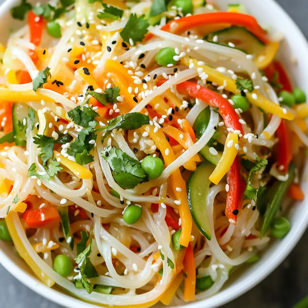 The main ingredients in this salad create a colorful and crunchy dish. The rice noodles serve as a great base. They soak up all the lovely flavors. Carrots add a sweet crunch. Cucumbers bring a refreshing bite. Red bell peppers offer a nice sweetness. Snap peas give a satisfying crunch. Green onions add a mild onion flavor. Cilantro brightens the dish and adds freshness. Finally, sesame seeds provide a nutty finish.