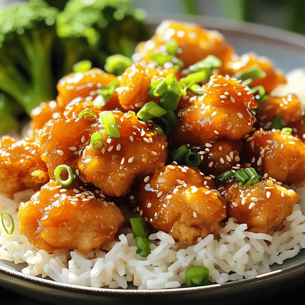 ![- Chicken Breast: I use 1 pound of chicken breast. It’s tender and juicy. Cut it into bite-sized pieces. This helps it cook evenly and soak up the flavors. - Orange Juice and Flavor Enhancers: Freshly squeezed orange juice is key. I love the bright flavor it brings. I also use low-sodium soy sauce and rice vinegar for a savory kick. Honey adds sweetness. - Essential Seasonings and Oils: Sesame oil creates a nutty flavor. I also use minced garlic and grated ginger for warmth. Finally, toasted sesame seeds give a nice crunch, and chopped green onions add freshness. These ingredients come together to create a dish that's both tasty and simple. You can find the full recipe at the end for all the details. Coating the Chicken Start by cutting the chicken breast into bite-sized pieces. This makes it easy to cook and eat. In a mixing bowl, toss these pieces with cornstarch. Make sure each piece gets a nice, even coat. This will make the chicken extra crispy when cooked. Heating Up the Skillet Next, heat the vegetable oil in a large skillet or wok over medium-high heat. Let it warm up for a couple of minutes. You want the oil hot enough to sear the chicken, but not smoking. Perfecting the Golden Brown Sear Once the oil is ready, add the chicken pieces in a single layer. Avoid crowding the pan, as this helps with even cooking. Cook for about 5-7 minutes. You want the chicken to turn golden brown and be fully cooked. Flip the pieces halfway through for a nice sear on both sides. Setting Chicken Aside After cooking, remove the chicken from the skillet. Place it on a plate and set it aside. This keeps the chicken warm and ready for the sauce. Sautéing Aromatics In the same skillet, lower the heat to medium. Add the minced garlic and grated ginger. Sauté these for about 30 seconds. Stir constantly to avoid burning. You want them to release their lovely aroma. Combining Key Sauce Ingredients Now, pour in the orange juice, low-sodium soy sauce, rice vinegar, honey, and sesame oil. Stir well to mix everything. Let the sauce simmer for 3-5 minutes. This helps it thicken and deepen in flavor. Tossing Chicken in the Sauce Return the cooked chicken to the skillet. Make sure each piece gets coated in the vibrant orange sauce. Cook for another 2-3 minutes. This allows the chicken to soak up those delicious flavors. Finishing Touches with Sesame Seeds Sprinkle the toasted sesame seeds over the chicken. Gently mix to combine. The seeds add a nice crunch to each bite. Plating for Presentation Serve the sesame orange chicken over fluffy jasmine rice or alongside steamed broccoli. Garnish with finely chopped green onions for a fresh touch. This dish looks as good as it tastes! For the complete recipe, check out the Full Recipe. Importance of Cornstarch Cornstarch is key for crispy chicken. It forms a light coating that fries well. This keeps the chicken juicy inside while creating a crunchy outside. Always toss your chicken pieces in cornstarch before cooking. This step is simple but very important. Optimal Cooking Temperature Cooking chicken at the right heat matters. Use medium-high heat when frying. This helps the chicken sear quickly. A good sear locks in moisture. If the heat is too low, the chicken may turn soggy. Balancing Sweetness and Acidity The sauce needs a good balance. Orange juice brings sweetness, but too much can be cloying. Add a splash of rice vinegar to cut through the sweetness. This makes the flavor bright and fresh. Adjust the honey too, if needed. Enhancing Flavor Profiles To make the sauce pop, think about adding more layers. You can add crushed red pepper for heat. This gives the dish a spicy kick. A squeeze of lime juice can also add zest and depth. Best Accompaniments Serve sesame orange chicken over fluffy jasmine rice. The rice soaks up the sauce well. Steamed broccoli adds color and crunch. You can also try it with a light salad for freshness. Presentation Ideas Make your plate look great! Use a white plate to show off the vibrant colors. Sprinkle toasted sesame seeds on top. Add finely chopped green onions as a bright garnish. This makes the dish pop and look appetizing. {{image_4}} You can easily switch up the protein in this sesame orange chicken recipe. - Tofu for a Vegetarian Version: Tofu makes a great substitute. It absorbs flavors well and gives a nice texture. Use firm or extra-firm tofu. Press it to remove excess water. Cut it into cubes and coat it with cornstarch just like chicken. Cook it until golden and crisp. - Using Shrimp for a Seafood Twist: Shrimp adds a different taste. Choose large shrimp for the best bite. Peel and devein them before cooking. Sauté the shrimp for just a few minutes until they turn pink. They cook faster than chicken, so watch them closely. You can also change up the flavor of your dish. - Add Spice with Chilis: If you enjoy heat, add chilis. You can use fresh chilis or dried red pepper flakes. This will give your dish a nice kick without overpowering the orange flavor. Add them when you sauté the garlic and ginger for the best results. - Incorporating Additional Vegetables: Adding vegetables makes the dish more colorful and healthy. Bell peppers, snap peas, or broccoli are great options. Slice them thin and toss them in the pan with the chicken. They will cook quickly and add crunch to your meal. For the complete recipe, check out the Full Recipe. - Refrigerating Leftovers: After enjoying your sesame orange chicken, allow it to cool down. Once cool, place leftovers in an airtight container. This helps keep the chicken fresh. Store it in the fridge for up to three days. Always remember to label the container with the date. - Freezing for Long-Term Preservation: To freeze, use a freezer-safe container or bag. Make sure to remove as much air as possible. This prevents freezer burn. Frozen sesame orange chicken stays good for about two to three months. When you're ready to eat it, just thaw in the fridge overnight. - Best Methods for Maintai