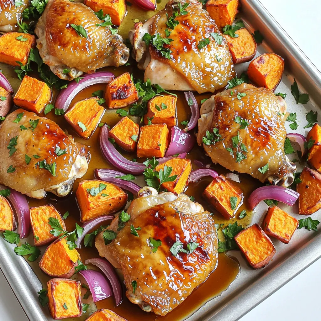 To make this dish, you need a few key ingredients. The chicken thighs bring rich flavor, while sweet potatoes add sweetness. Red onion gives a nice bite to the mix. Maple syrup adds a touch of sweetness that will caramelize beautifully in the oven.