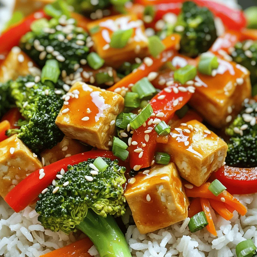 - 1 block (14 oz) firm tofu - 1 red bell pepper, sliced into thin strips - 1 cup broccoli florets, cut into bite-sized pieces - 1 medium carrot, thinly sliced - 3 green onions, finely chopped, white and green parts separated - 2 cloves garlic, finely minced - 1 inch fresh ginger, peeled and grated When I make sweet chili tofu stir fry, I start with firm tofu. It holds its shape and gives a great texture. I slice the tofu into bite-sized cubes, making it easy to eat. Adding fresh vegetables like red bell pepper, broccoli, and carrot brings color and crunch. The green onions add a nice zing, while garlic and ginger give a warm flavor that makes this dish pop. - 1/4 cup sweet chili sauce - 2 tablespoons soy sauce - 1 tablespoon lime juice, freshly squeezed The sauce is the star of this dish. Sweet chili sauce provides a perfect balance of sweetness and heat. I mix it with soy sauce for depth and freshly squeezed lime juice for brightness. This trio creates a sauce that clings to the tofu and veggies, making every bite flavorful. - Sesame seeds - Fresh cilantro For garnishes, I love using sesame seeds. They add a nice crunch and look great on the dish. Fresh cilantro gives a fresh taste that makes the stir fry even more vibrant. These garnishes are optional, but they really enhance the meal. This recipe is simple, quick, and full of flavors. You can customize it to your taste and enjoy a colorful dish on your plate. To start, drain the tofu block well. This step removes excess water. Next, wrap it in a clean towel. Place something heavy on top. Let it sit for about 15 minutes. This helps the tofu become firmer. Now, cut the pressed tofu into 1-inch cubes. Place the cubes in a bowl. Sprinkle 2 tablespoons of cornstarch over the tofu. Toss gently, coating all sides. This coating helps the tofu become crispy when cooked. Heat 1 tablespoon of vegetable oil in a large skillet over medium-high heat. Wait until the oil shimmers. Carefully add the tofu cubes in a single layer. Fry for 3-4 minutes on each side. Turn gently to avoid breaking the cubes. The tofu should be golden brown and crispy. Once done, take the tofu out and set it aside on a plate. In the same skillet, add another tablespoon of vegetable oil. Next, toss in the sliced red bell pepper, broccoli florets, and thinly sliced carrot. Stir-fry these veggies for 4-5 minutes. Keep stirring to ensure they cook evenly. The goal is vibrant colors and a slightly tender but still crisp texture. Add minced garlic and grated ginger to the skillet with the veggies. Stir-fry for 1 more minute. This step brings out their great aroma. Now, return the crispy tofu to the skillet. Pour in the sweet chili sauce, soy sauce, and fresh lime juice. Gently toss everything together. Cook for another 2-3 minutes until heated through. Finally, take the skillet off the heat. Garnish your stir fry with chopped green onions and sprinkle with sesame seeds. Enjoy the bright flavors and textures in this dish! Tofu can be a great meat alternative, but it needs some care. First, press the tofu. This step removes extra water, which helps the tofu become crispy. It also helps the tofu soak up flavors better. After pressing, cut the tofu into cubes. Next, coat the cubes in cornstarch. This coating is key. It makes the outside crunchy when you fry it. Toss the cubes gently, ensuring each side is covered well. To elevate your dish, think about extra seasonings. You can add a pinch of salt or a dash of pepper. Some chili flakes can bring heat. Fresh herbs like basil or cilantro can add a bright taste too. Don’t skip fresh lime juice! It adds a punch that wakes up all the flavors. Squeeze it right before serving for the best taste. When it comes to sides, pair your stir fry with jasmine rice or quinoa. Both make great bases for the sweet chili tofu. You can also serve it with a side salad for freshness. For a nice touch, use a big bowl. Serve the stir fry over rice and drizzle more sweet chili sauce on top. Finish with sesame seeds and fresh cilantro for a beautiful look. {{image_4}} You can switch tofu for other proteins. Chicken or shrimp works well in this dish. Just cut them into bite-sized pieces. Cook them until golden brown. They add a nice flavor and texture. If you want a vegan option, try chickpeas or tempeh. Both are tasty and full of protein. They soak up flavors well, making your stir fry delicious. Feel free to use any fresh vegetables you like. Seasonal veggies add great taste. Try snap peas, zucchini, or bell peppers. You can mix and match depending on what you have. If you don’t like certain veggies, leave them out. The stir fry is flexible, so use what makes you happy! You can change the sauce to fit your taste. If you want it sweeter, add more sweet chili sauce. For a spicy kick, add chili flakes or sriracha. You can also make your own sweet chili sauce. Just combine sugar, vinegar, and garlic for a quick version. This gives you control over the flavors! After cooking, let your sweet chili tofu stir fry cool down. You can store it in the fridge. Place it in an airtight container. This way, it stays fresh longer. It keeps well for up to three days. Don’t leave it out at room temperature for more than two hours. To reheat, you have a few options. The best way is to use a stovetop. Heat a skillet over medium heat and add a splash of water. This keeps the tofu and veggies moist. Stir gently until it’s hot. You can also use a microwave. Place it in a microwave-safe bowl and cover it. Heat in short bursts, stirring in between. This helps maintain the texture. You can freeze your stir fry if you want to save it for later. To freeze, let it cool completely. Then, pack it into freezer-safe bags. Try to remove as much air as possible. This helps prevent freezer burn. When ready to eat, take it out of the freezer. Thaw it overnight in the fridge. Reheat on the stovetop or microwave as mentioned above. Enjoy your tasty meal later! Making this dish takes about 25 