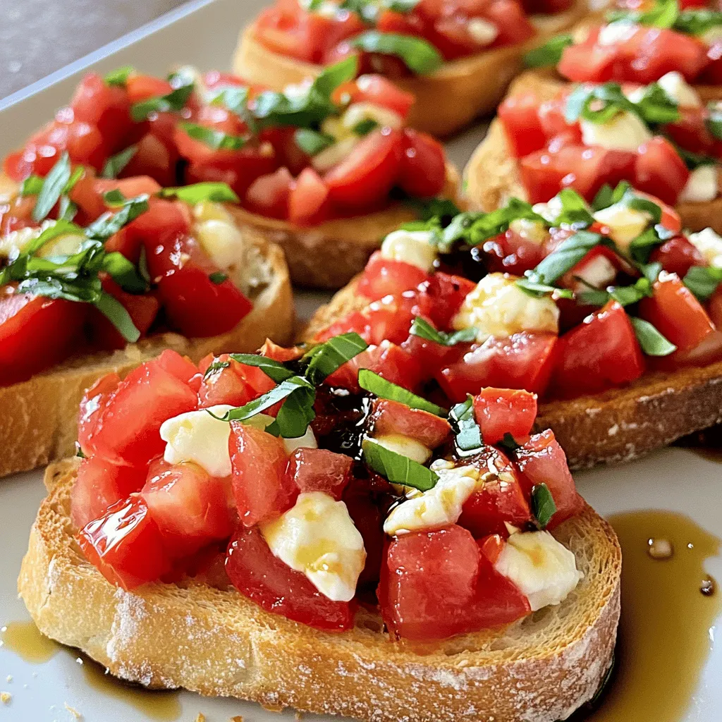 - 6 ripe Roma tomatoes, diced into small cubes - 1 cup fresh basil leaves, finely chopped - 2 cloves garlic, minced finely I love using Roma tomatoes for their firm texture. They hold up well when diced. Fresh basil adds a bright flavor. I always chop it finely to release its oils. Garlic gives the bruschetta a nice kick. The more finely you chop it, the better. - 2 tablespoons balsamic vinegar - 3 tablespoons extra virgin olive oil - Salt and freshly ground black pepper, to taste - 1 French baguette, sliced into 1/2 inch thick pieces Balsamic vinegar adds sweetness and tang. Extra virgin olive oil enriches the mix with flavor. I recommend using good quality oil for the best taste. Salt and pepper help balance the dish. The French baguette is perfect for toasting. Its crispy crust complements the soft topping. - 1/4 cup shredded mozzarella cheese for a delightful garnish Mozzarella is not a must, but it brings creaminess. If you want to indulge, sprinkle it on top. It melts slightly over the hot bruschetta, making it extra tasty. You can also skip it for a lighter option. Start by dicing six ripe Roma tomatoes into small cubes. Use a sharp knife for clean cuts. Next, finely chop one cup of fresh basil leaves. The smell will fill your kitchen with joy! Mince two cloves of garlic and add them to the bowl. Mix all these ingredients gently. Drizzle two tablespoons of balsamic vinegar and three tablespoons of extra virgin olive oil over the mix. Sprinkle salt and freshly ground black pepper to taste. Toss the mixture well and let it rest for about 15 minutes. This time helps the flavors blend nicely. While the tomato and basil mix rests, preheat your oven to 375°F (190°C). Grab one French baguette and slice it into pieces about half an inch thick. Place the baguette slices on a baking sheet in a single layer. Brush one side of each slice with olive oil. This step gives the bread a lovely crunch. Toast the baguette in the oven for 5 to 7 minutes. Keep an eye on them until they turn golden brown. Once they are crispy, take them out and let them cool for a minute. Now comes the fun part! Spoon the tomato and basil mixture generously onto the toasted side of each baguette slice. Make sure each piece gets a good amount. If you like, sprinkle shredded mozzarella cheese on top for extra flavor. Serve the bruschetta right away. You can add extra basil leaves or a drizzle of balsamic vinegar to make it look fancy. Enjoy this easy and fresh appetizer with friends or family! For the best bruschetta, I always pick ripe Roma tomatoes. They have a sweet taste and fewer seeds. This means you get more juicy flesh. Look for bright red tomatoes that feel firm but not hard. If they smell sweet, they are ripe and ready to use. Trust me, using fresh, good-quality tomatoes makes a big difference. Toasted baguette is key for great bruschetta. I slice the baguette into 1/2 inch thick pieces. Then, I brush one side with extra virgin olive oil. This adds flavor and helps it crisp up. Toast in the oven at 375°F for 5-7 minutes. You want them golden brown and crunchy. Watch them closely so they don’t burn. Want to take your bruschetta to the next level? Add a splash of balsamic vinegar for tang. A sprinkle of salt and black pepper brings out all the flavors. If you love cheese, try adding shredded mozzarella on top. It melts nicely and adds creaminess. For extra flavor, top with a few fresh basil leaves before serving. {{image_4}} You can add cheese to your bruschetta for extra flavor. Mozzarella is a great choice. It melts nicely and adds creaminess. Just sprinkle shredded mozzarella on top after you add the tomato mix. You can also try goat cheese or feta for a tangy twist. Each cheese brings a unique taste that pairs well with fresh tomatoes and basil. Want to change things up? Consider adding pesto or avocado. Pesto gives a rich, herby flavor. Just spread a thin layer on the bread before adding the tomato mix. For a creamy touch, mash ripe avocado and spread it on the toast. Both options make your bruschetta even more delicious and fun. You can adapt bruschetta to fit each season. In summer, add diced peaches or watermelon for a sweet touch. In fall, try roasted butternut squash or pumpkin. These seasonal ingredients keep the dish fresh and exciting. They also add color and new tastes, making your appetizer stand out. To store leftover bruschetta, place it in an airtight container. Keep it in the fridge. It will last for about two days. The bread may get soggy, so store the topping separate if you can. This way, you keep the crunch of the bread. When you want to enjoy the bruschetta again, reheat the bread in the oven. Set the oven to 375°F (190°C). Place the bread on a baking sheet for about 5 minutes. This will bring back its crispy texture. Avoid microwaving it, as it will make the bread soft and chewy. You can freeze the bruschetta topping if you have extra. Place it in a freezer-safe bag. Squeeze out the air and seal it tightly. It can stay in the freezer for up to three months. When you're ready, thaw it in the fridge overnight. Then, toast your bread fresh and add the topping. Enjoy the taste of summer anytime! You can prepare the tomato and basil mixture a few hours in advance. Mix the diced tomatoes, basil, and garlic. Add balsamic vinegar and olive oil, then season with salt and pepper. Let it rest for about 15 minutes as it melds flavors. Store this in the fridge until you are ready to serve. Toast the baguette slices just before serving. This keeps them crispy. The best bread for bruschetta is a French baguette. It has a nice crust and soft inside. Slice it into half-inch thick pieces. You can also use ciabatta or other crusty bread. The goal is to have a sturdy slice that holds toppings well. To keep bruschetta from getting soggy, toast the bread until it is golden brown and crispy. Use a heavy layer of tomato topping to avoid direct moisture touching the bread. If you are preparing in advance, s