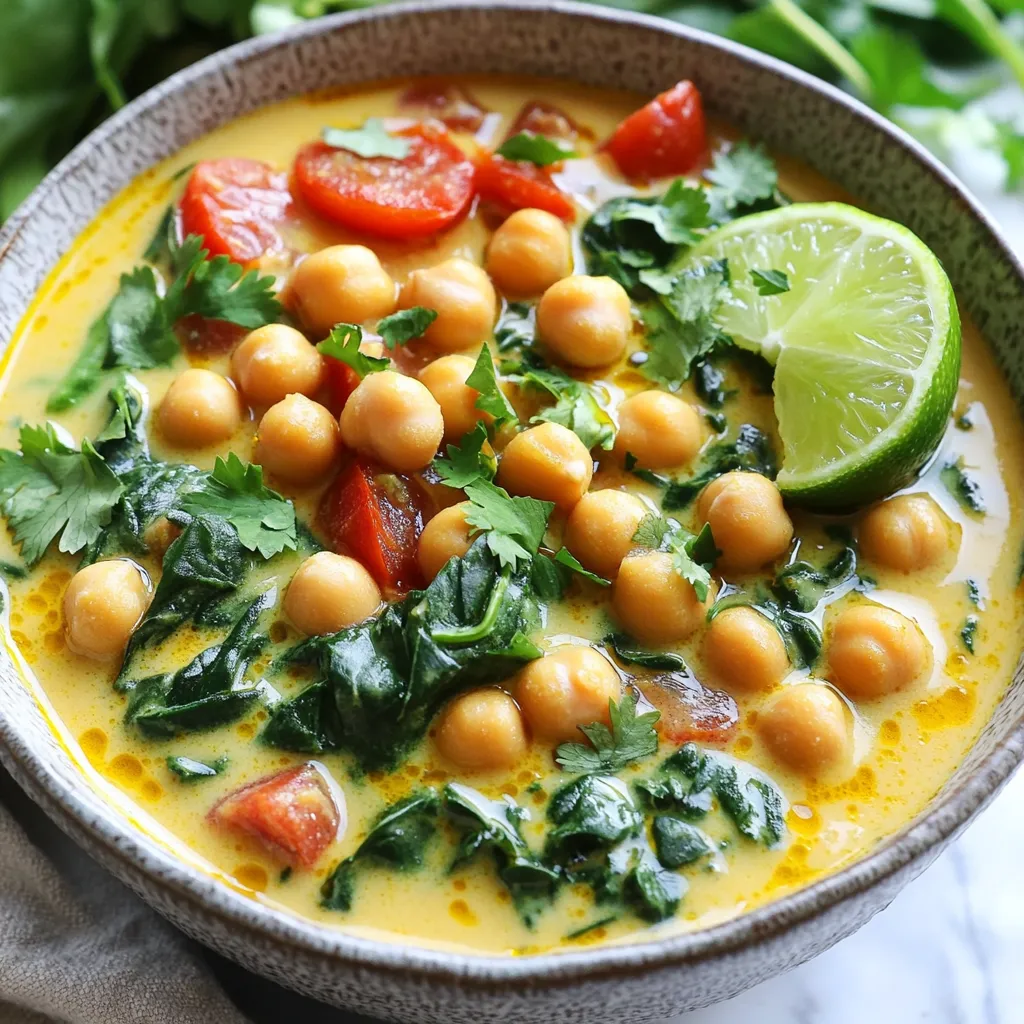 To make Vegan Coconut Curry Chickpea Soup, gather these ingredients: - 1 tablespoon coconut oil - 1 medium onion, finely diced - 3 cloves garlic, minced - 1 tablespoon fresh ginger, finely grated - 1 tablespoon curry powder - 1 teaspoon ground turmeric - 1 can (14 oz) coconut milk - 4 cups vegetable broth - 1 can (15 oz) chickpeas, thoroughly drained and rinsed - 1 cup diced tomatoes (fresh or canned) - 2 cups fresh spinach or kale, roughly chopped - Salt and freshly cracked black pepper to taste - Juice of 1 juicy lime - Fresh cilantro leaves, roughly chopped for garnish This soup is packed with nutrition. The chickpeas give you protein and fiber. They help keep you full. Coconut milk adds healthy fats and gives the soup a creamy texture. Spinach and kale are loaded with vitamins and minerals. They boost your immune system and support overall health. Garlic and ginger help fight inflammation and promote good digestion. Using fresh ingredients helps maximize these benefits. When shopping for your ingredients, look for these tips: - Choose onions that are firm and have no soft spots. - Garlic should be hard and dry. Avoid any that feel soft or sprout. - Pick fresh ginger that feels heavy and has smooth skin. - For greens, look for vibrant colors. They should be crisp, not wilted. - If using tomatoes, go for ones that are firm and fragrant. - Always check the expiration date on canned goods. Start by heating a large pot on medium heat. Add the coconut oil. When it melts, toss in the diced onion. Sauté this for about 5 minutes. You want the onion soft and clear. Next, add minced garlic and grated ginger. Cook for 1 to 2 minutes until you smell their lovely aroma. Now, sprinkle in the curry powder and ground turmeric. This brings out their full taste. Sauté the spices for another minute. Then, pour in the creamy coconut milk and the vegetable broth. Stir well to mix everything together. Increase the heat a little and let it simmer gently. Once the soup simmers, add the drained chickpeas and diced tomatoes. Stir to combine, then let this simmer for 15 minutes. This allows the flavors to blend nicely. After 15 minutes, add the chopped spinach or kale. Cook for another 5 minutes until the greens are wilted and tender. Finally, taste your soup. Add salt and pepper to your liking. Squeeze in the lime juice for a zesty kick. Your soup is now ready to serve! - Large pot - Wooden spoon or spatula - Measuring spoons - Knife and cutting board - Can opener - Prep time: 10 minutes - Cooking time: 20 minutes - Total time: 30 minutes This soup serves 4. You can enjoy it as a light meal or pair it with crusty bread for a hearty dish. To make your vegan coconut curry chickpea soup even tastier, try these tips: - Use fresh herbs: Fresh cilantro adds a bright taste. - Add spice: If you like heat, add red pepper flakes or fresh chili. - Citrus zest: Grate some lime zest for extra zing. - Toast spices: Before adding liquids, toast curry powder and turmeric in coconut oil for more depth. Many people make mistakes when cooking this soup. Here are some to watch out for: - Skipping the sauté: Don’t rush! Sautéing onion, garlic, and ginger builds flavor. - Not draining chickpeas: Always rinse and drain canned chickpeas to avoid a gritty texture. - Overcooking greens: Add spinach or kale near the end. This keeps them bright and tender. - Ignoring seasoning: Taste your soup before serving. Adjust salt and pepper to your liking. Serve your soup in deep bowls for a cozy feel. Here are some great pairings: - Rice or Quinoa: Serve it over rice or quinoa for a hearty meal. - Crusty Bread: Pair with crusty bread for dipping. - Salad: A fresh salad with lime dressing complements the soup well. - Coconut Rice: For a tropical twist, try coconut rice on the side. These tips and tricks will help you enjoy a delicious and satisfying vegan coconut curry chickpea soup. Happy cooking! {{image_4}} If you have dietary needs, you can still enjoy this soup. Here are some easy swaps: - Oil: Use olive oil or avocado oil instead of coconut oil for a different flavor. - Chickpeas: Swap chickpeas for lentils if you prefer. They cook faster and add protein. - Vegetable Broth: If you're low-sodium, choose a low-sodium broth for a healthier option. - Greens: Kale works well, but you can use Swiss chard or collard greens too. Adjust the flavor to fit your taste. Here’s how: - Spice Levels: Want it spicy? Add chili flakes or diced jalapeños. Start with a small amount and taste. - Curry Powder: Try different curry powders for unique flavors. You can use Thai red curry paste for a kick. - Herbs: Add fresh basil or mint for a fresh twist. They brighten the soup nicely. Make this soup your own with these swaps: - Coconut Milk: For a lighter soup, use almond milk or oat milk. It changes the texture but keeps it creamy. - Tomatoes: Fresh, canned, or even roasted tomatoes work great. Roasted adds a nice depth of flavor. - Add-ins: Consider adding sweet potatoes or carrots for sweetness and texture. Simply chop and cook them with the onions. Feel free to mix and match these ideas. Personalizing this soup makes it even more fun and tasty! After enjoying your Vegan Coconut Curry Chickpea Soup, you’ll likely have some left. Let the soup cool down to room temperature first. Then, transfer it to an airtight container. This keeps the soup fresh and tasty. You can store it in the fridge for up to five days. If you want to keep it longer, freezing is a great option. To freeze your soup, use freezer-safe containers or bags. Make sure to leave some space at the top for expansion. This soup can last in the freezer for about three months. When you're ready to eat it, just take it out and let it thaw in the fridge overnight. When you’re ready to enjoy your soup again, reheat it on the stove over medium heat. Stir it often to ensure even heating. If it seems a bit thick, add a splash of vegetable broth or water. You can also reheat it in the microwave. Ju