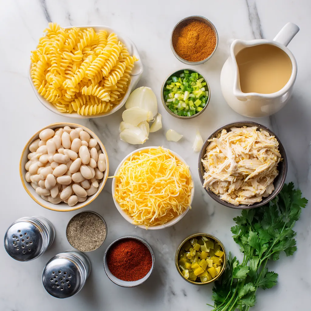- 1 pound rotini pasta: This fun pasta shape holds the creamy sauce well. - 2 cups cooked chicken (shredded): I like using rotisserie chicken for added flavor. - 1 can (15 oz) white beans: Great northern or cannellini work best. Rinse them well! - 1 can (4 oz) diced green chilies: These add a mild kick and depth. - 1 small onion, finely chopped: It brings sweetness when cooked. - 2 cloves garlic, minced: Garlic adds a strong flavor that makes the dish pop. - 4 cups low-sodium chicken broth: This is the base for the creamy sauce. - 1 cup heavy cream: It makes the dish rich and smooth. - 1 tablespoon olive oil: This helps sauté the onion and garlic. - 1 teaspoon ground cumin: Cumin gives a warm, earthy taste. - 1 teaspoon chili powder: It adds a slight heat and depth. - Freshly ground salt and pepper to taste: Adjust these to suit your liking. - 1 cup shredded Monterey Jack cheese: This cheese melts beautifully into the dish. - Fresh cilantro, chopped: Use it as a garnish for a fresh touch. These ingredients come together to create a comforting dish. Each one serves a purpose, adding to the flavor and texture. As you gather these items, think about how they will mix and meld together in your pot. Enjoy the process! {{ingredient_image_2}} To start, bring a large pot of salted water to a rolling boil. The salt adds flavor and helps the pasta cook evenly. Once boiling, add the 1 pound of rotini pasta. Cook it according to the package instructions until it’s al dente, which means it should be firm but not hard. This usually takes 8 to 10 minutes. After cooking, drain the pasta in a colander and set it aside. To achieve the perfect al dente texture, remember to taste the pasta a minute or two before the suggested cooking time. It should have a slight bite when you chew it. In the same pot, lower the heat to medium. Add 1 tablespoon of olive oil and let it warm until it shimmers. Next, toss in the finely chopped onion. Sauté the onion for about 3 to 4 minutes, stirring often, until it becomes translucent and fragrant. Then, add 2 cloves of minced garlic, along with 1 teaspoon of ground cumin and 1 teaspoon of chili powder. Stir continuously for about a minute. This step is key! It lets the spices bloom, which brings out their full flavor. Now, slowly pour in 4 cups of low-sodium chicken broth. Stir well and bring the mixture to a gentle simmer. Then, add 2 cups of shredded chicken, 1 can of drained white beans, and 1 can of diced green chilies. Mix everything together until well combined. After that, lower the heat to low. Introduce 1 cup of heavy cream to the pot, stirring gently until fully blended. Allow the dish to warm for about 3 to 4 minutes, but make sure it doesn’t boil. Carefully fold the cooked rotini into the creamy mixture. Stir until the pasta is evenly coated with the chili sauce. Taste and adjust the seasoning by adding salt and freshly ground pepper to your liking. Finally, remove the pot from heat. Mix in 1 cup of shredded Monterey Jack cheese. Stir until the cheese melts completely, creating a rich and creamy texture. Dish out your creamy chili mac into bowls. For a vibrant touch, garnish each serving with fresh chopped cilantro. Enjoy your creation! - Cooking pasta to perfection: Start with a large pot of salted water. Bring it to a rolling boil. Add your rotini pasta and cook until al dente. This usually takes 8-10 minutes. After cooking, drain it right away to stop the cooking process. This will keep your pasta firm and not mushy. - Ensuring cream doesn’t curdle: Add the heavy cream on low heat. Stir it gently into the pot. Be careful not to let it boil. Boiling can cause the cream to curdle. Keep the heat low and mix well until creamy. - Suggesting additional spices or ingredients: Want to kick it up a notch? Add more chili powder or a dash of cayenne for heat. You can also toss in some cumin seeds for a deeper flavor. Fresh lime juice can add a zesty touch too! - Optional garnishes for presentation: Serve your chili mac with fresh cilantro on top. You could also add a dollop of sour cream for creaminess. A sprinkle of extra cheese adds a nice touch too. For a burst of freshness, try lime wedges on the side. Pro Tips Use Rotisserie Chicken: For a quick and flavorful base, using rotisserie chicken saves time and enhances the dish's overall taste. Adjust Spice Level: Feel free to add more chili powder or a pinch of cayenne pepper if you prefer a spicier chili mac. Cheese Variations: Swap the Monterey Jack cheese for Pepper Jack or even cheddar for a different flavor profile. Garnish Creatively: Try adding diced avocado or a dollop of sour cream for extra creaminess and a fresh touch. {{image_4}} You can change the protein in this dish easily. Instead of chicken, try using turkey. Ground turkey works well and keeps the dish lean. If you want something different, use shredded beef or pork. You can even use tofu for a fun twist. Each swap adds a unique taste to your chili mac. To make a meatless version, skip the chicken entirely. Add more beans for protein. Black beans or pinto beans are great choices. You can also add some veggies, like bell peppers or zucchini. This keeps the dish filling and delicious. You won’t miss the meat at all! Explore different chili or bean styles to liven up your dish. You can use kidney beans for a bolder flavor. Try adding different types of chili peppers for heat. Chipotle peppers add a nice smokiness. For a creamier texture, mix in some cream cheese. Each variation gives you a new way to enjoy this tasty meal! To keep your white chicken chili mac fresh, choose an airtight container. Glass or plastic containers work well. Store in the fridge for up to three days. If you want to keep it longer, place it in the freezer. It can stay good for up to three months. Just remember to label your container with the date. To reheat your chili mac, use the stovetop for the best results. Pour it into a pot over low heat. Stir often to keep it creamy